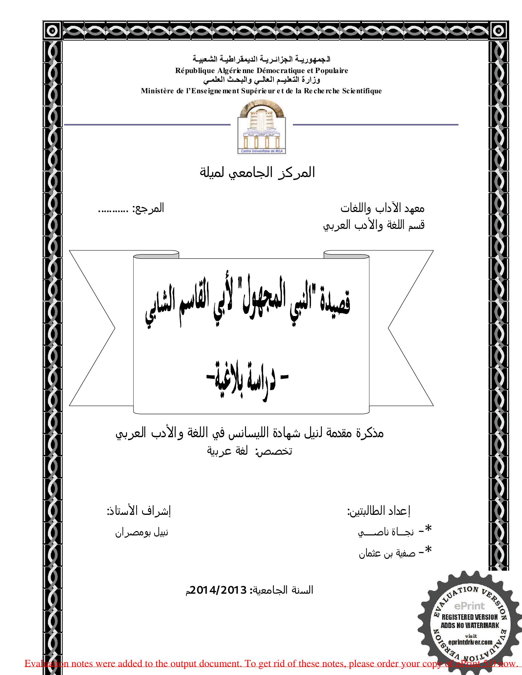ناصي نجاة et al. (2014). قصيدة " النبي المجهول "لأبي القاسم الشابي - دراسة بلاغية -.