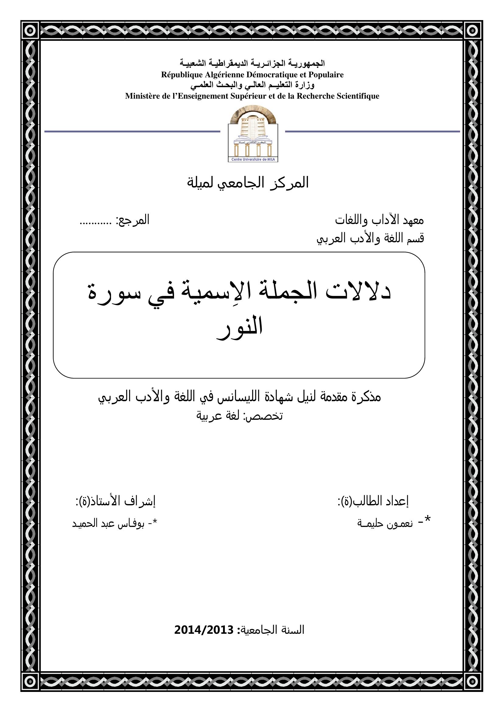نعمون حليمة & بوفاس عبد الحميد(مشرفا) (2014). دلالات الجملة الإسمية في سورة النور.