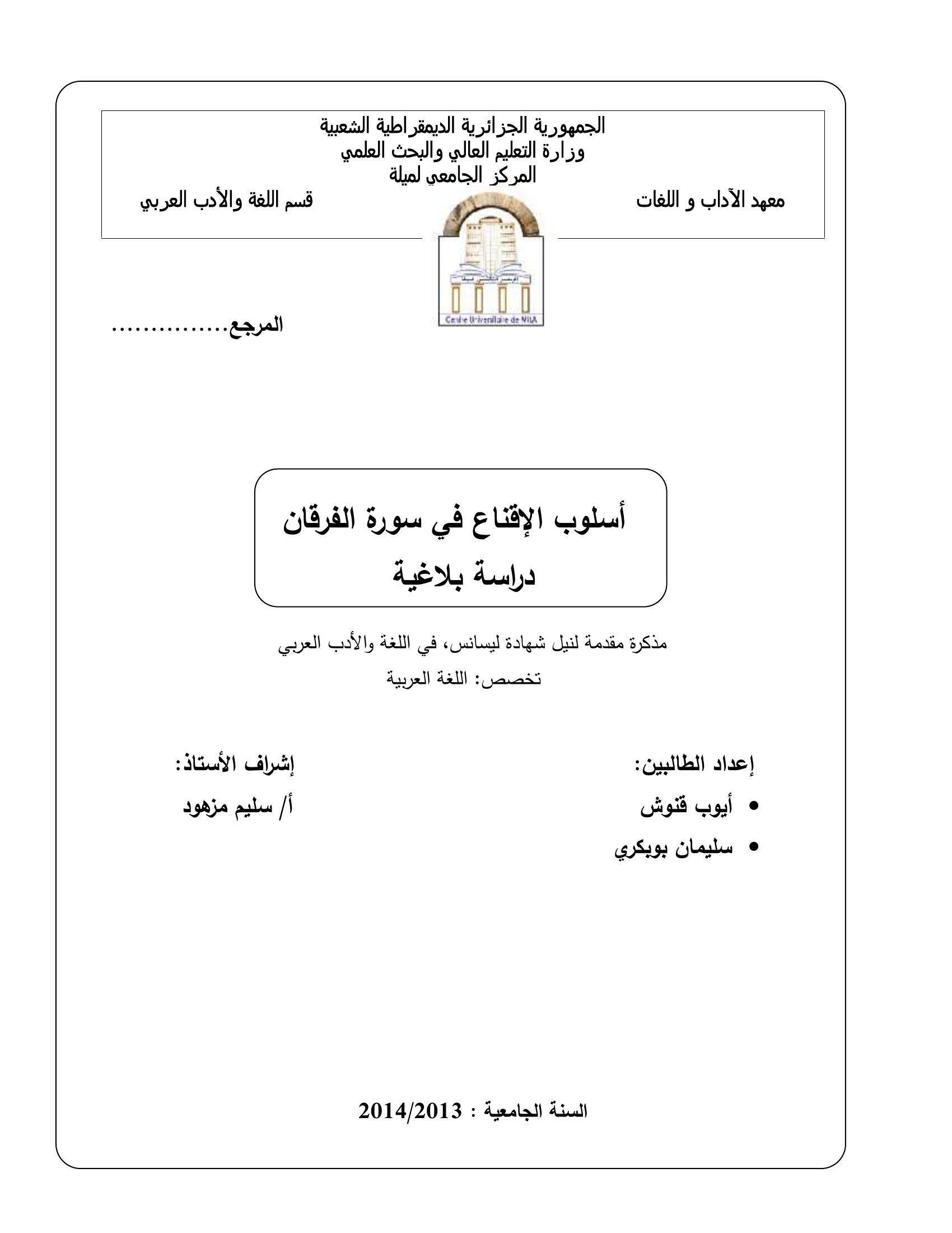 قنوش أيوب et al. (2014). أسلوب الإقناع في سورة الفرقان دراسة بلاغية.