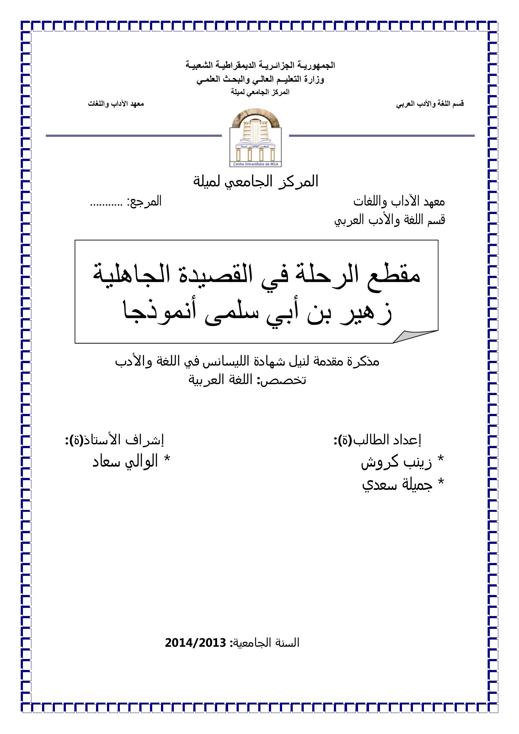 سعدي جميلة et al. (2014). مقطع الرحلة في القصيدة الجاهلية زهير بن أبي سلمى أنموذجا.