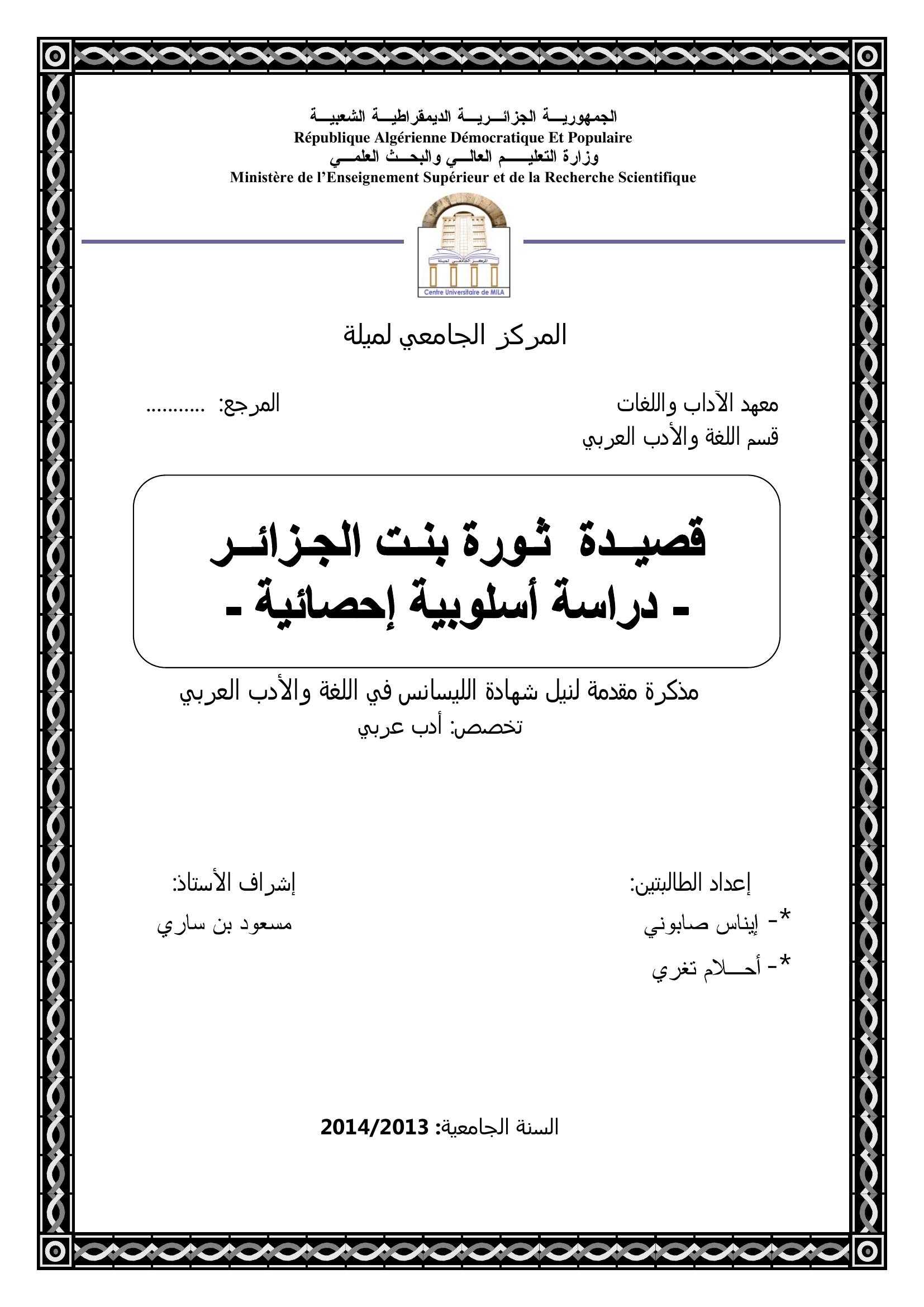 صابوني إيناس et al. (2014). قصيدة ثورة بنت الجزائر - دراسة أسلوبية إحصائية -.