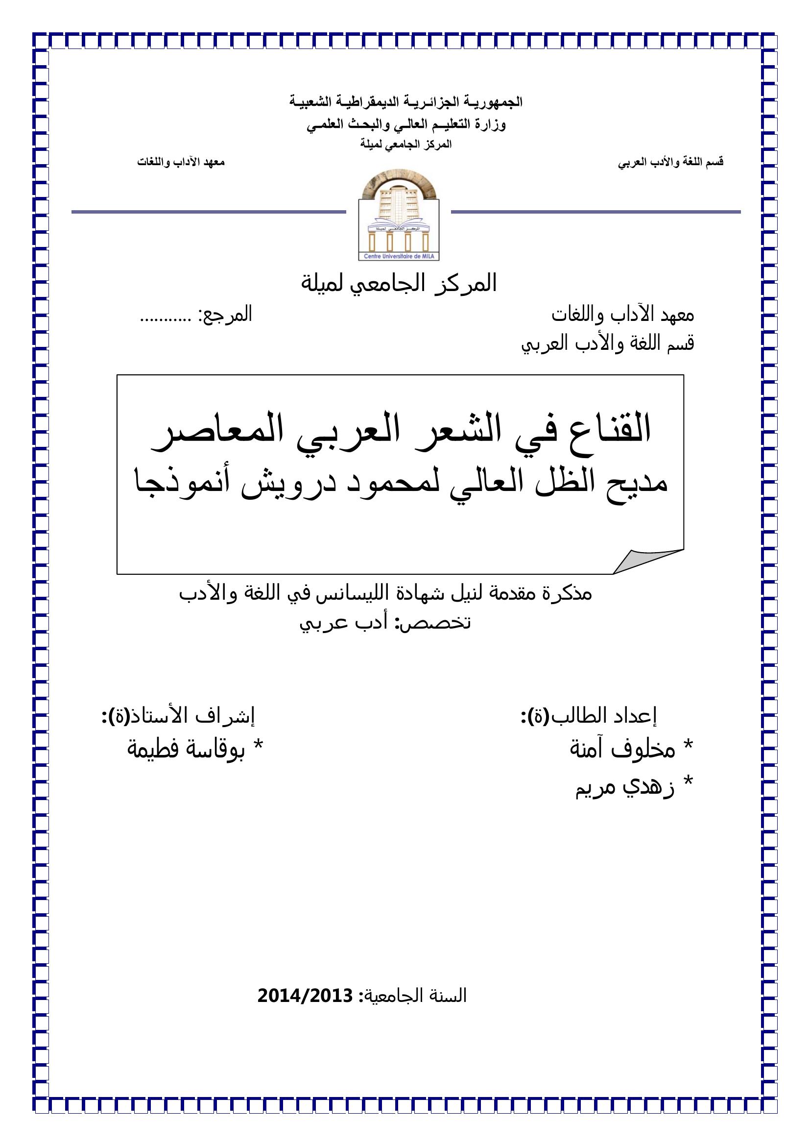 آمنة مخلوف et al. (2014). القناع في الشعر العربي المعاصر " مديح الظل العالي " لمحمود درويش أنموذجا.