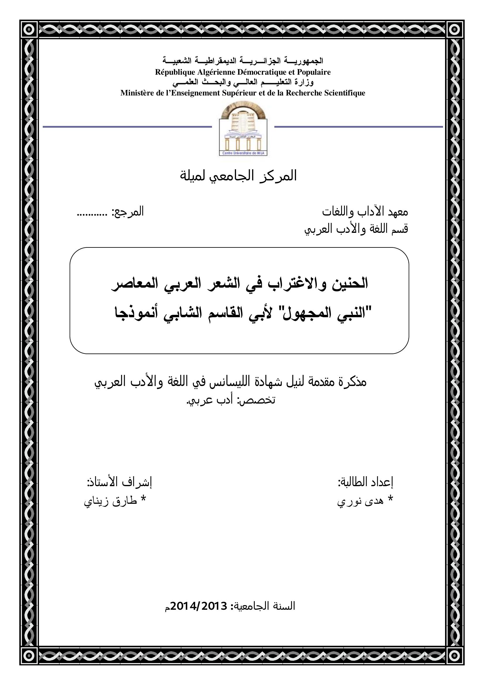 نوري هدى & زيناي طارق(مشرفا) (2014). الحنين والاغتراب في الشعر العربي المعاصر "النبي المجهول " لأبي القاسم الشابي أنموذجا.