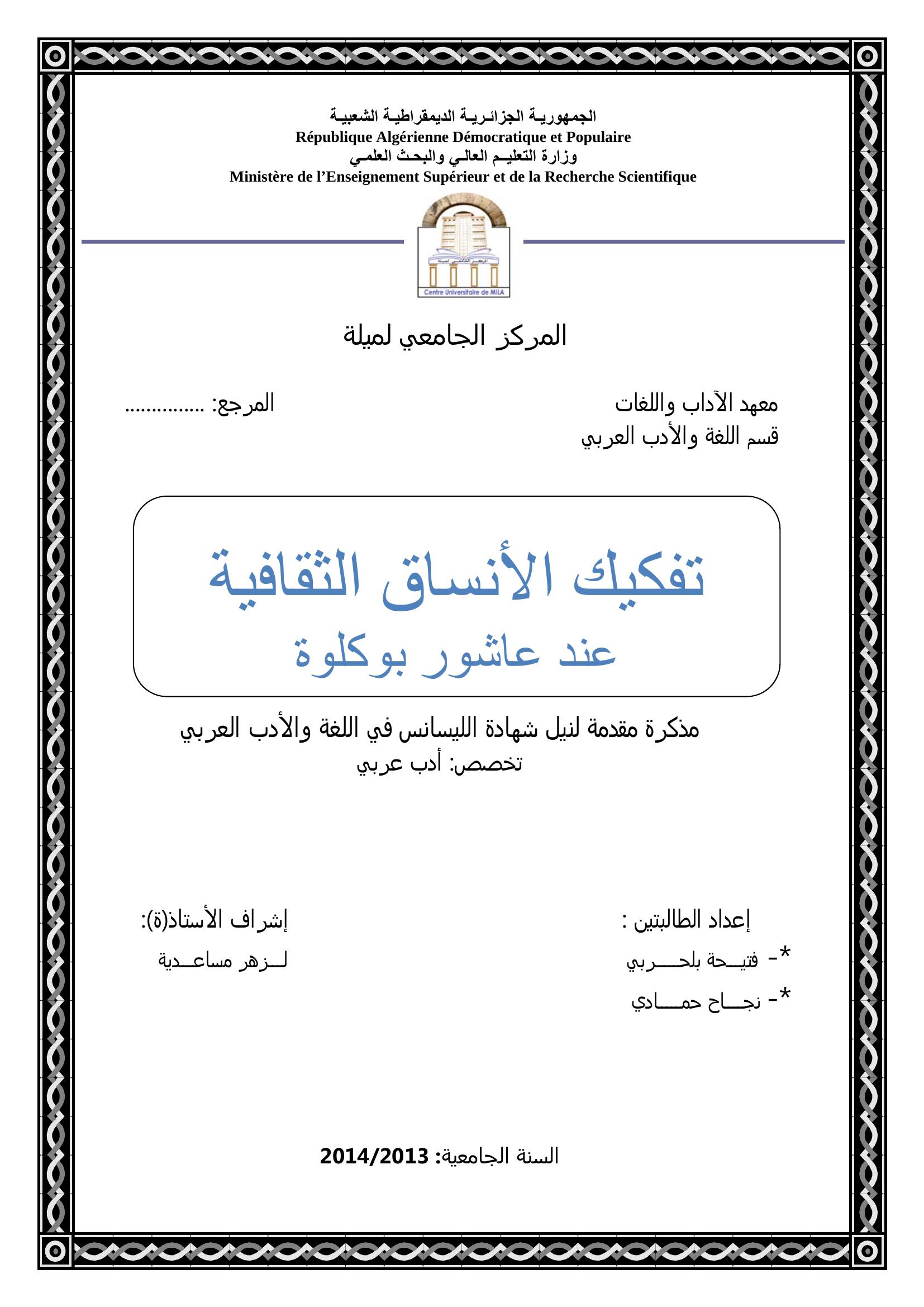 بلحربي فتيحة et al. (2014). تفكيك الأنساق الثقافية عند عاشور بوكلوة.