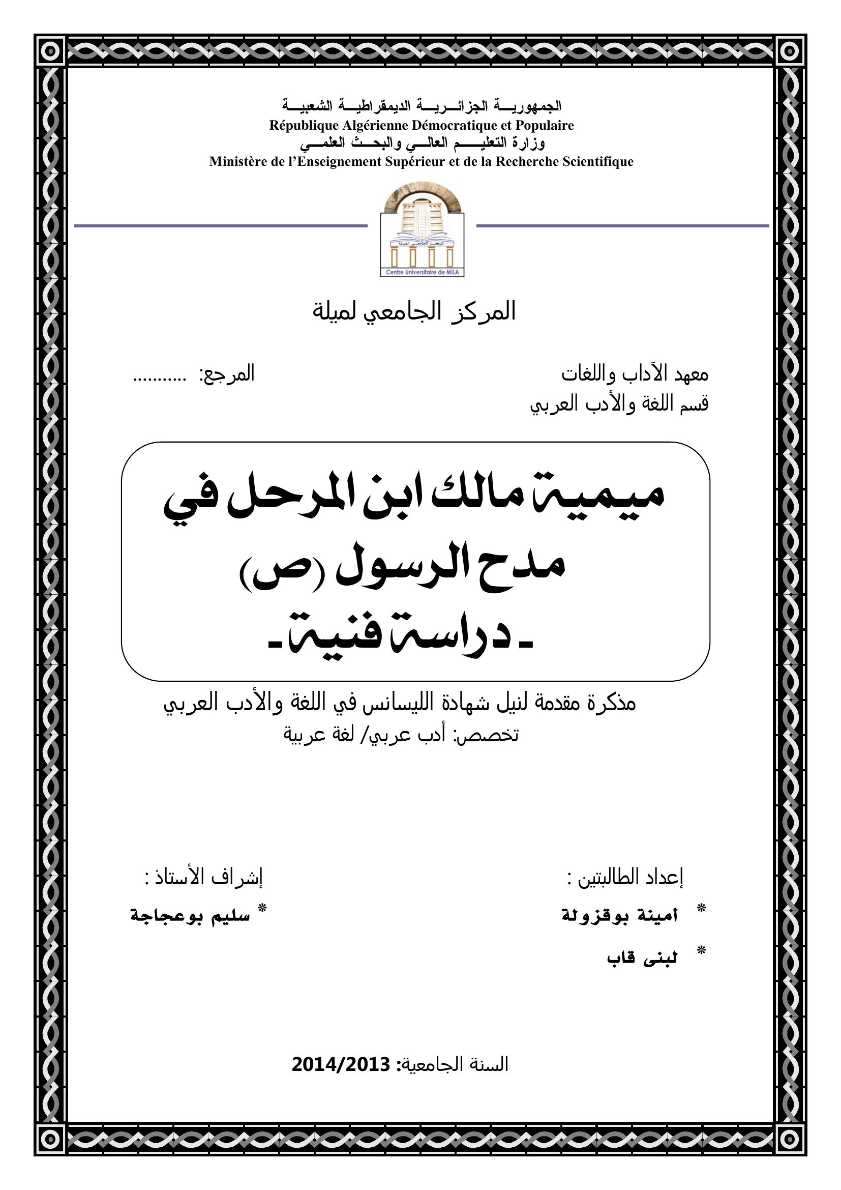 بوقزولة أمينة et al. (2014). ميمية مالك ابن المرحل في مدح الرسول (ص) - دراسة فنية -.