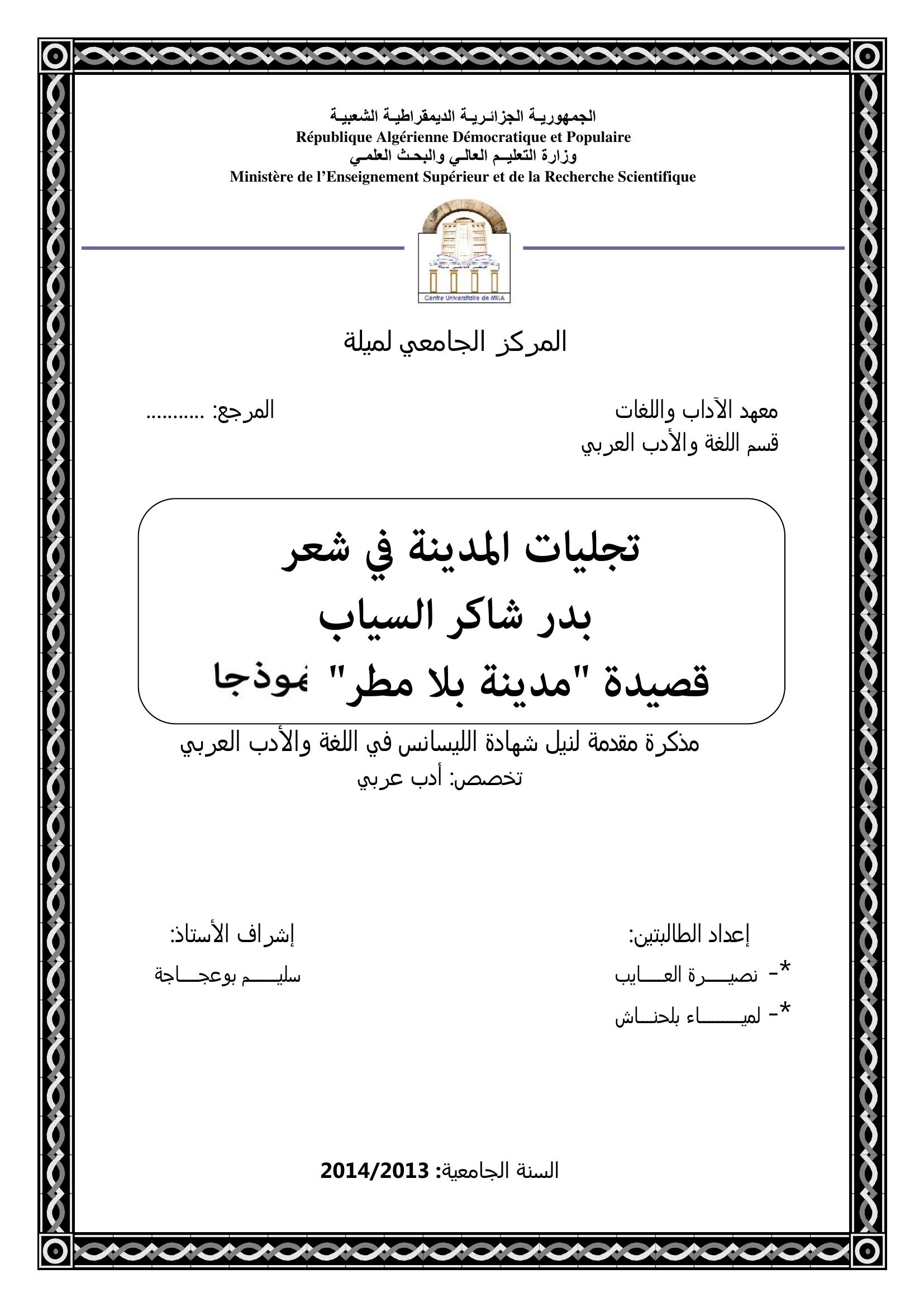 العايب نصيرة et al. (2014). تجليات المدينة في شعر بدر شاكر السياب قصيدة " مدينة بلا مطر" نمودجا.