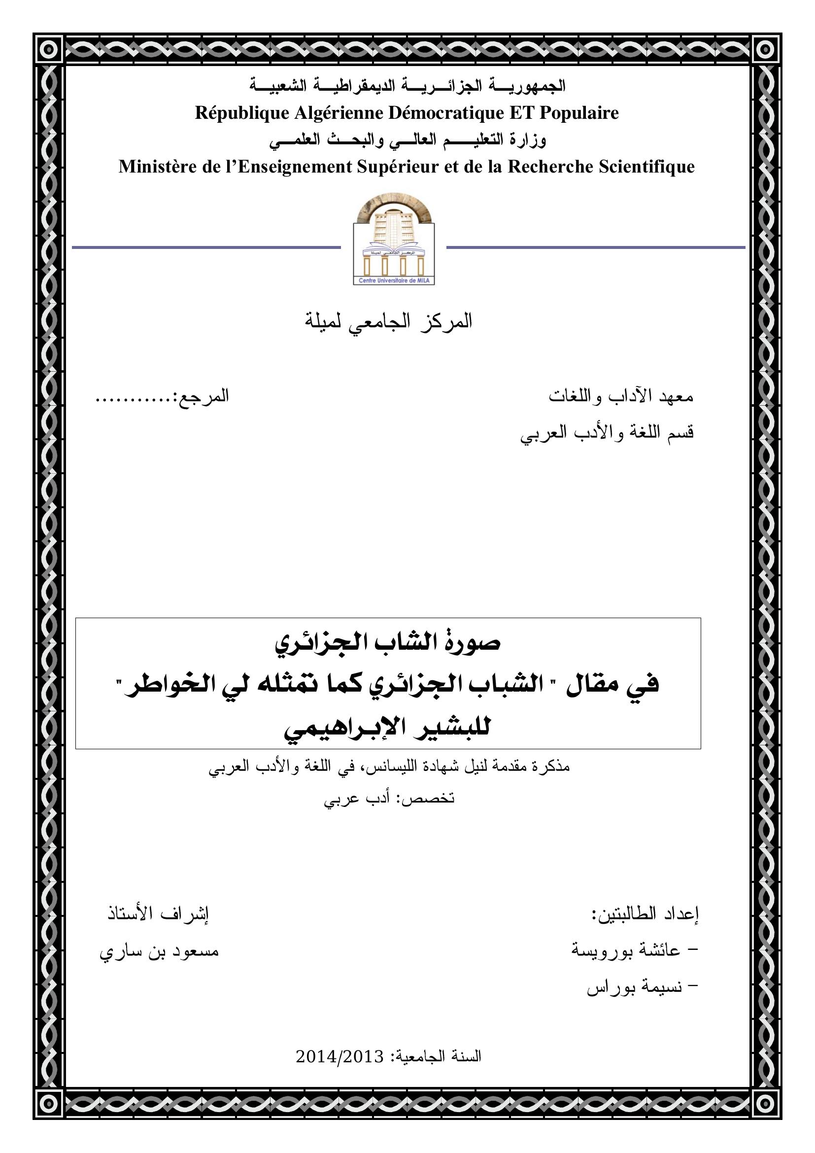 بورويسة عائشة et al. (2014). صورة الشاب الجزائري في مقال " الشاب الجزائري كما تمثله لي الخواطر" للبشير الإبراهيمي.