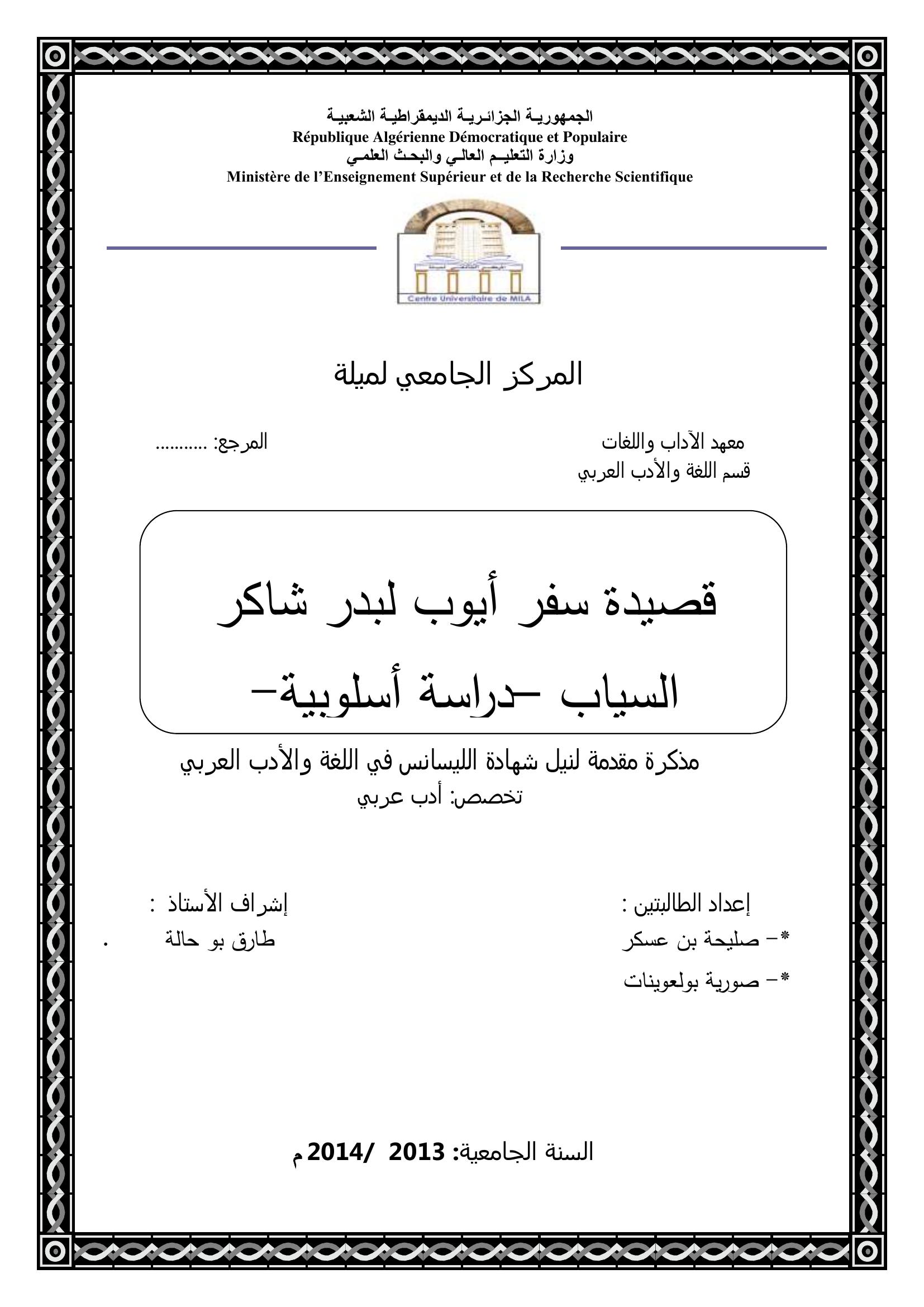 بن عسكر صليحة et al. (2014). قصيدة سفر أيوب لبدر شاكر السياب - دراسة اسلوبية -.
