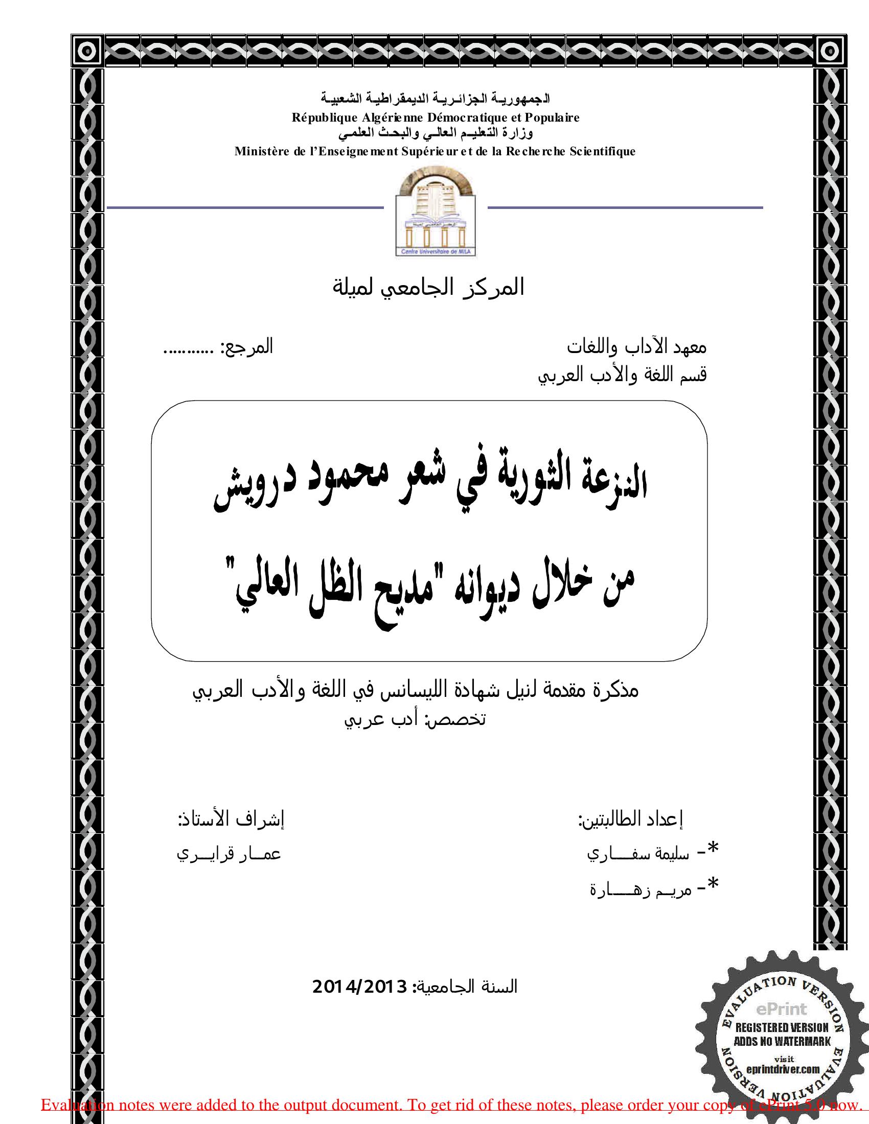سفاري سليمة et al. (2014). النزعة الثورية محمود درويش من خلال ديوانه "مديح الظل العالي".