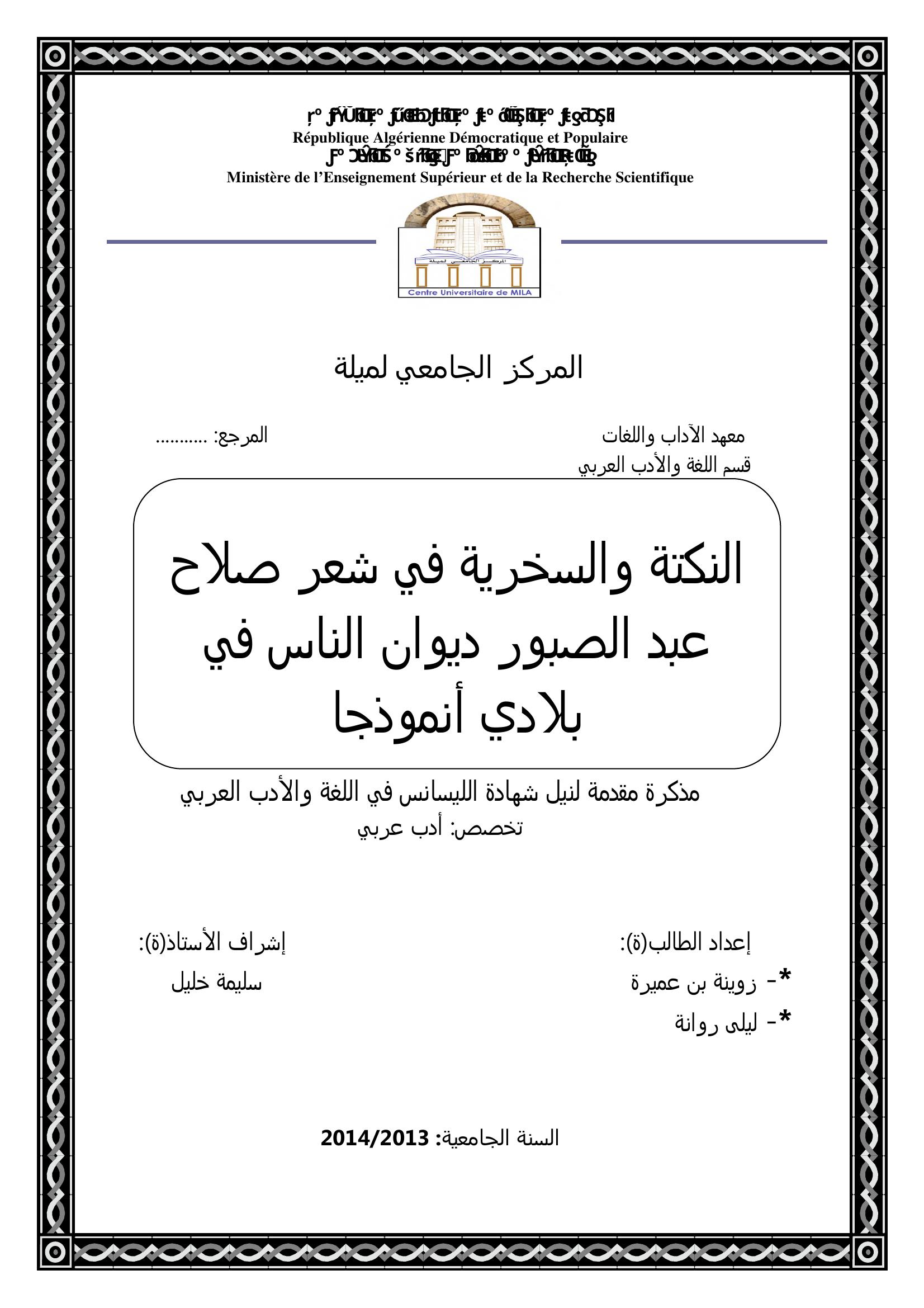 بن عميرة زوينة et al. (2014). النكتة والسخرية في شعر صلاح عبد الصبور ديوان الناس في بلادي أنموذجا.