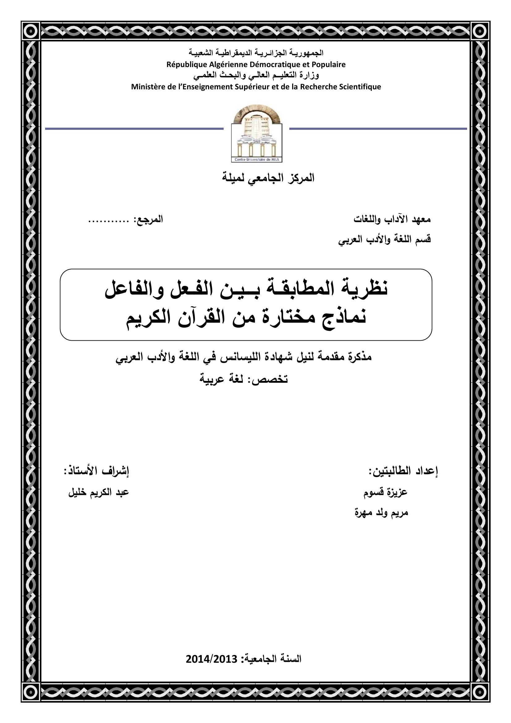 قسوم عزيزة et al. (2014). نظرية المطابقة بين الفعل والفاعل - نماذج مختارة من القرآن الكريم-.