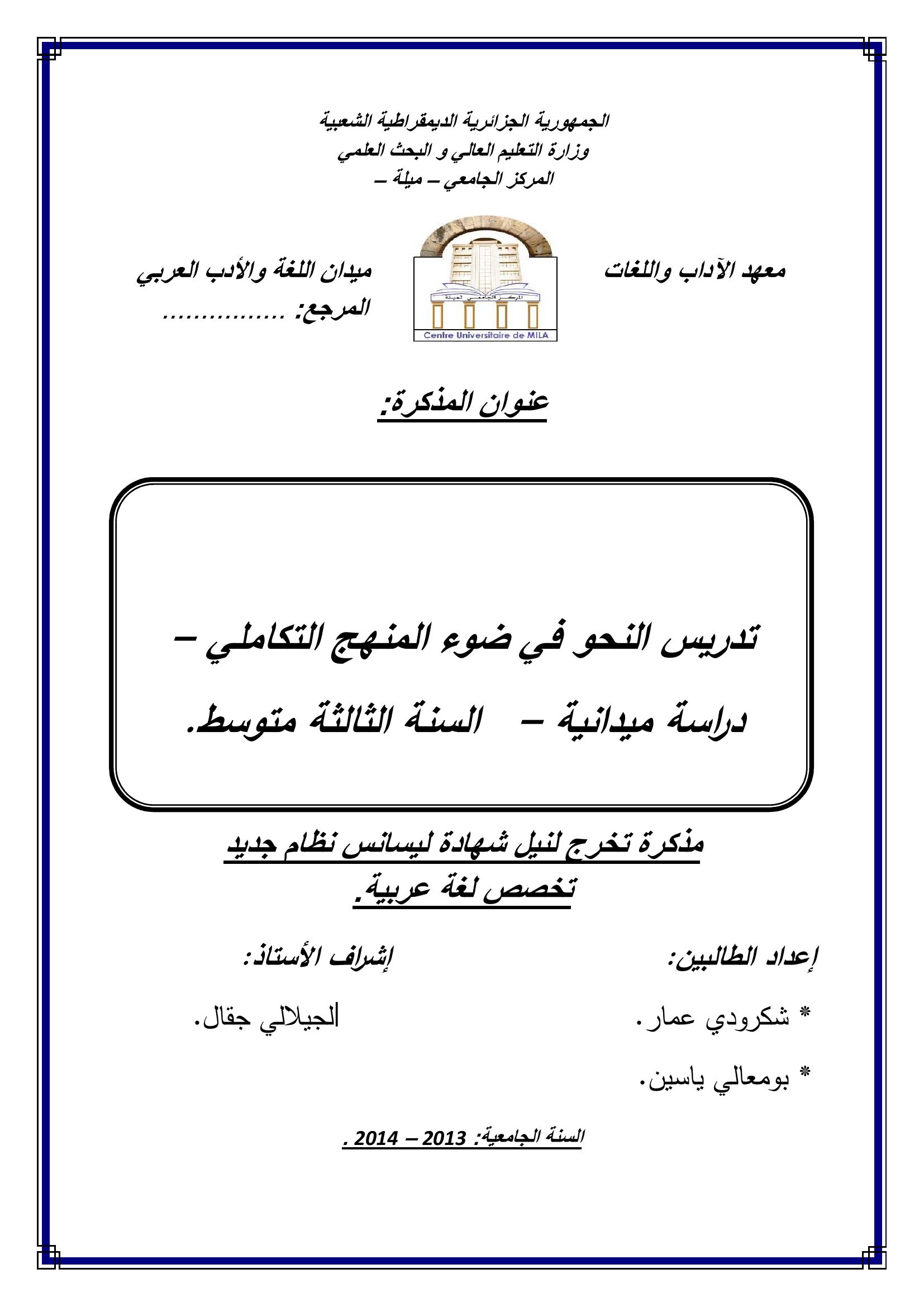 شكرودي عمار et al. (2014). تدريس النحو في ضوء المنهج التكاملي - دراسة ميدانية - السنة الثالثة متوسط.
