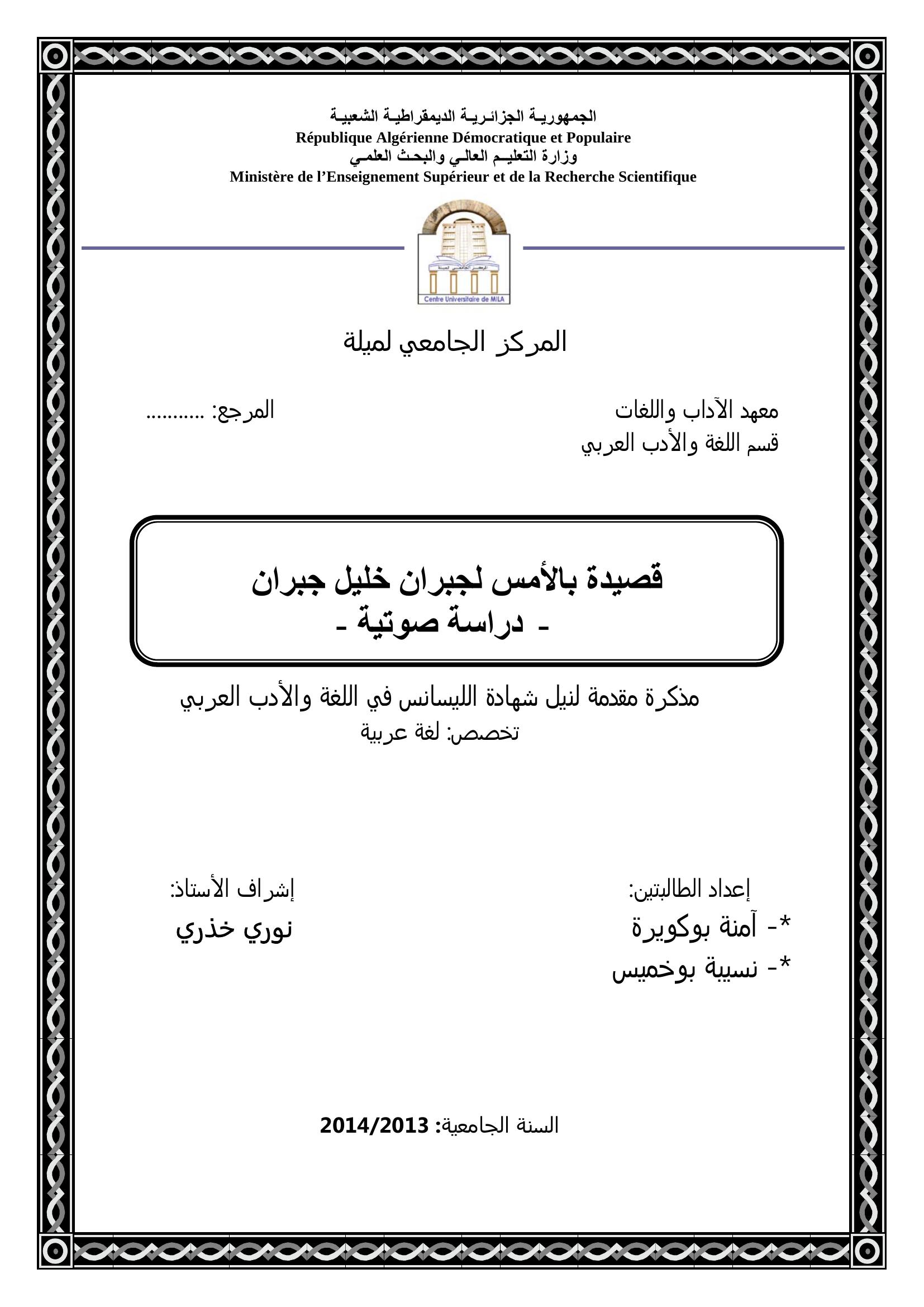 بوكويرة آمنة et al. (2014). قصيدة بالأمس لجبران خلبل جيران -دراسة صوتية -.