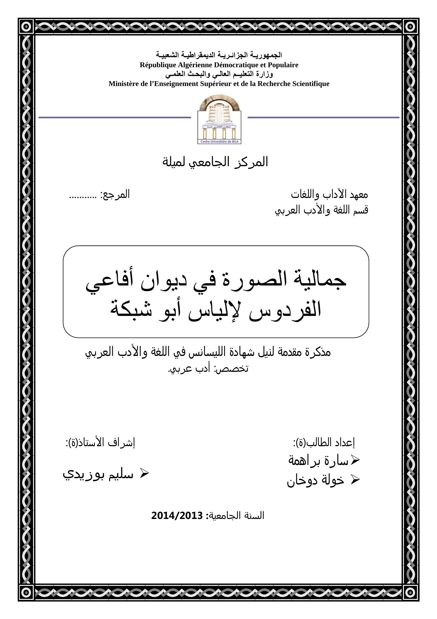 براهمة سارة et al. (2014). جمالية الصورة في ديوان أفاعي الفردوس لإلياس أبو شبكة.