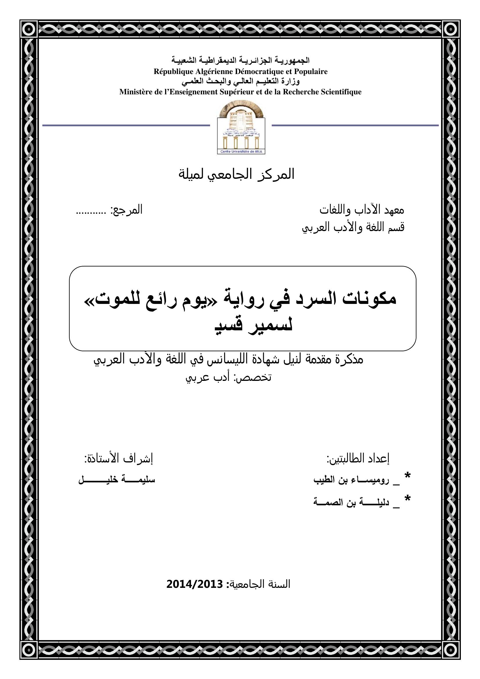 بن الطيب روميساء et al. (2014). مكونات السرد في رواية " يوم رائع للموت" لسمير قسيمي.