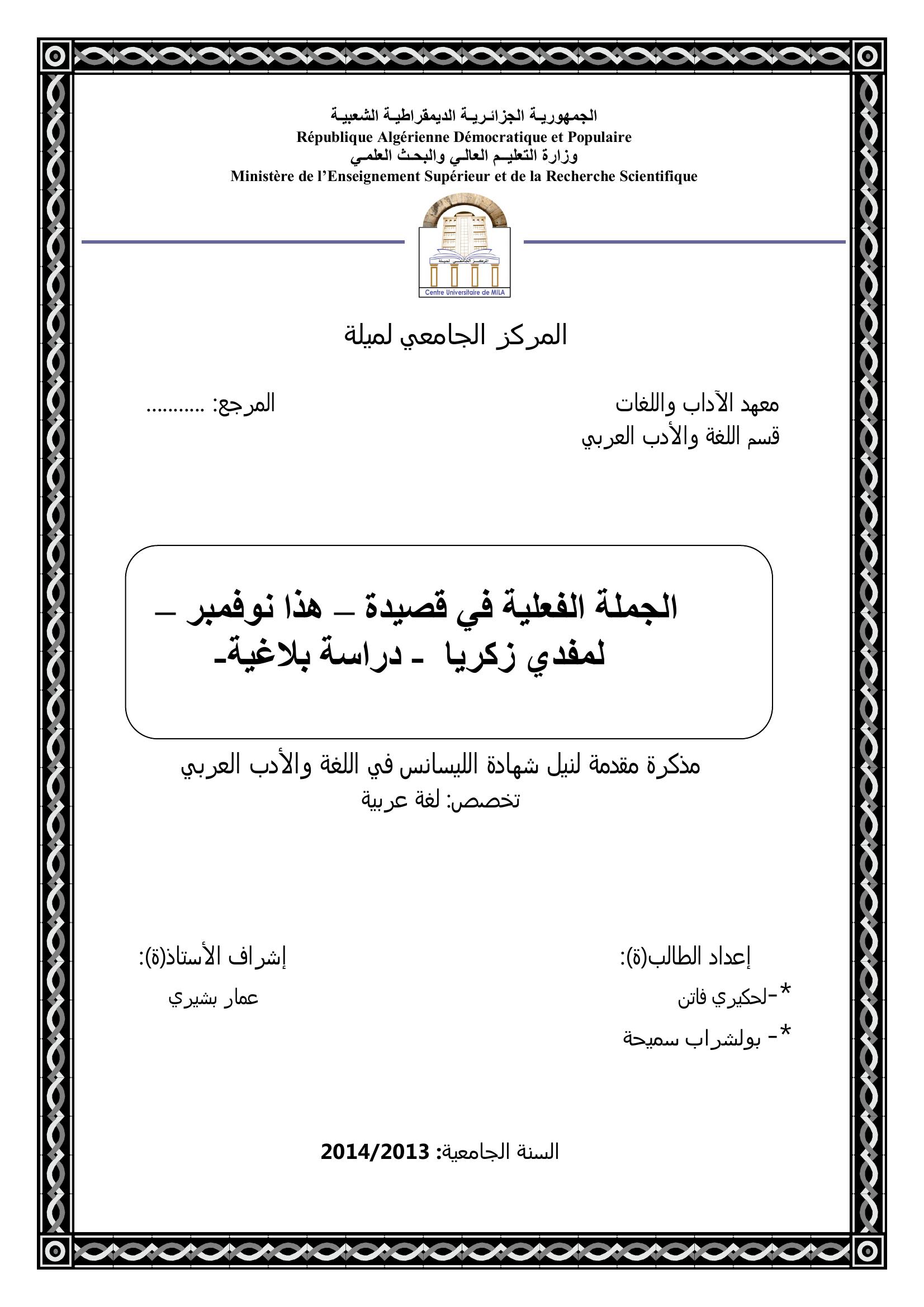 لحكيري فاتن et al. (2014). الجملة الفعلية في قصيدة " هذا نوفمبر" لمفدي زكريا - دراسة بلاغية -.