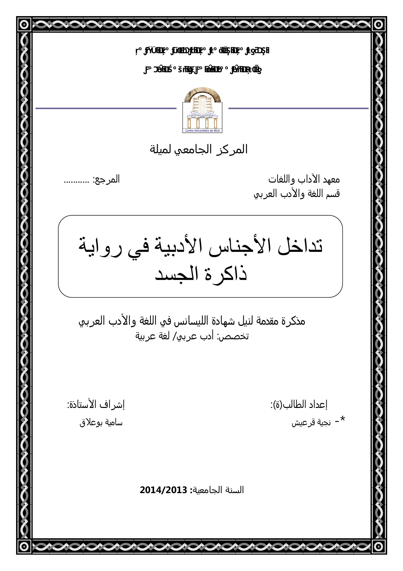 قرعيش نجية & بوعلاق سامية(مشرفا) (2014). تداخل الأجناس الأدبية في رواية ذاكرة الجسد.