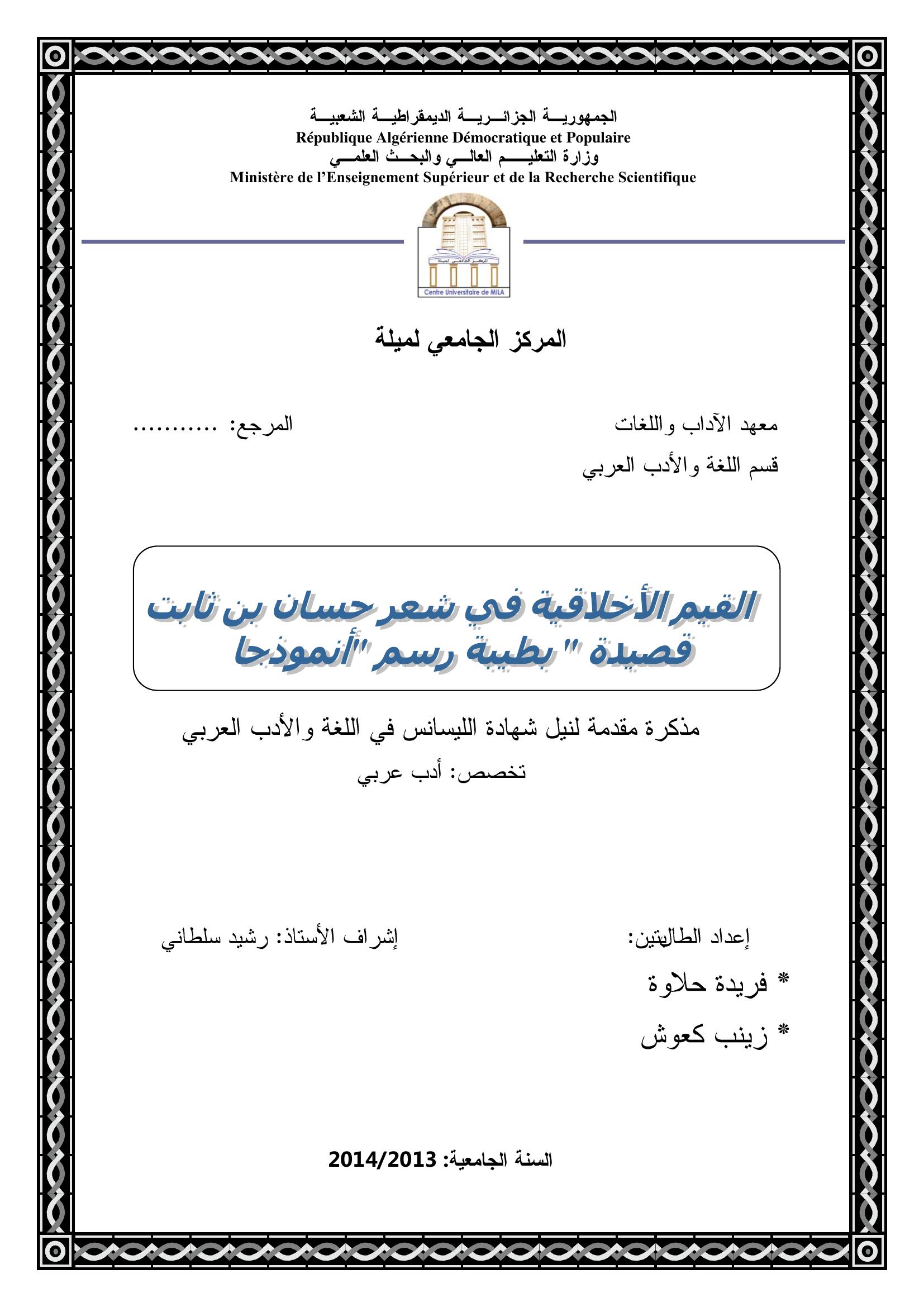 حلاوة فريدة et al. (2014). القيم الأخلاقية في شعر حسان بن ثابت قصيدة " بطيبة رسم " أنموذجا.