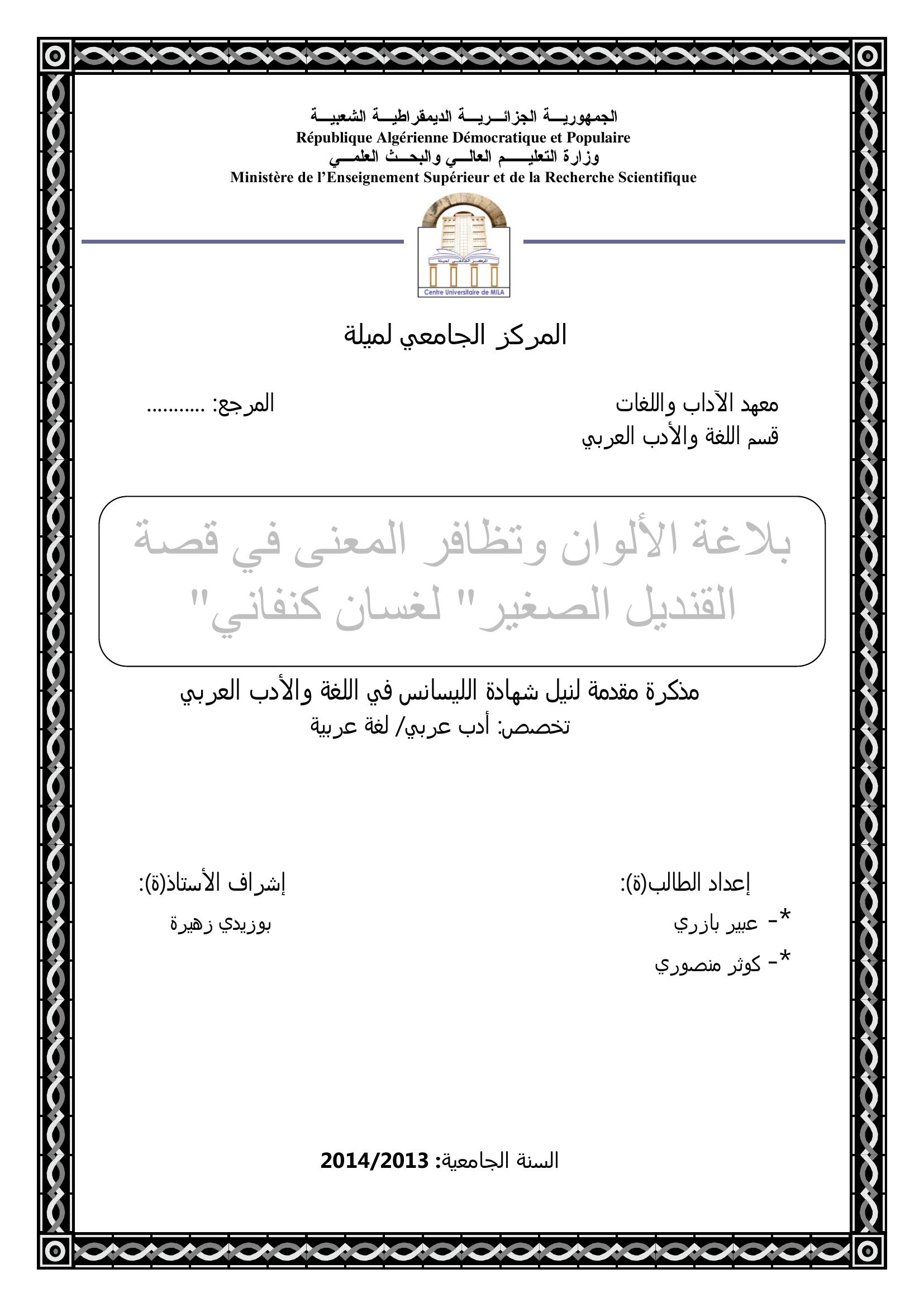 بازري عبير et al. (2014). بلاغة الألوان وتظافر المعنى في قصة القنديل الصغير "لغسان كنفاني".