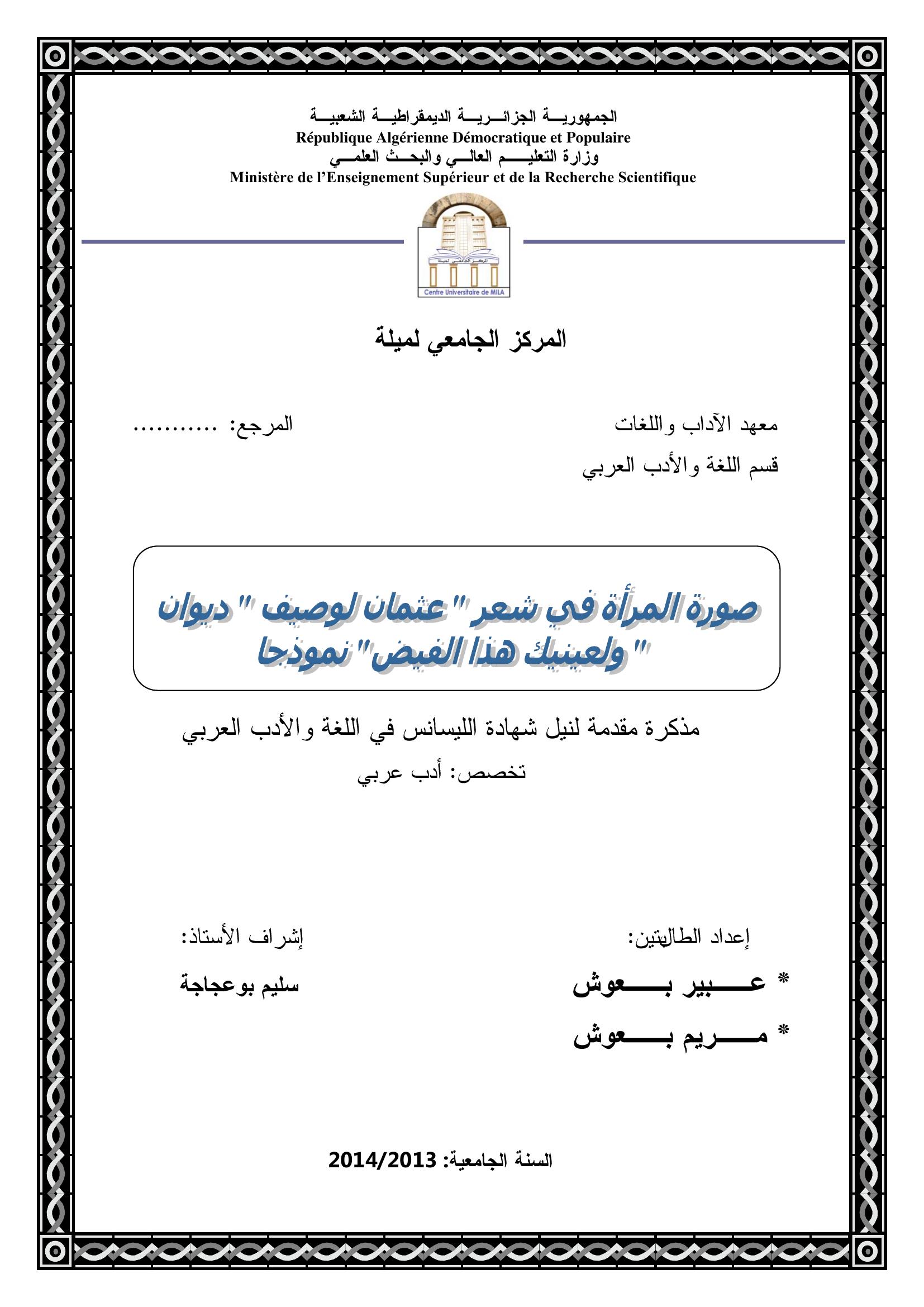 بعوش عبير et al. (2014). صورة المرأة في شعر"عثمان لوصيف" ديوان ولعينيك هذا الفيض" أنموذجا.