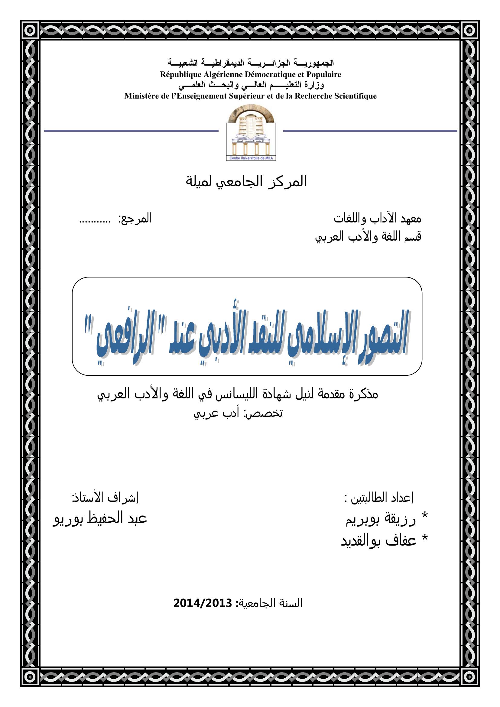 بوبريم رزيقة et al. (2014). التصور الإسلامي للنقد الأدبي عند " الرافعي ".