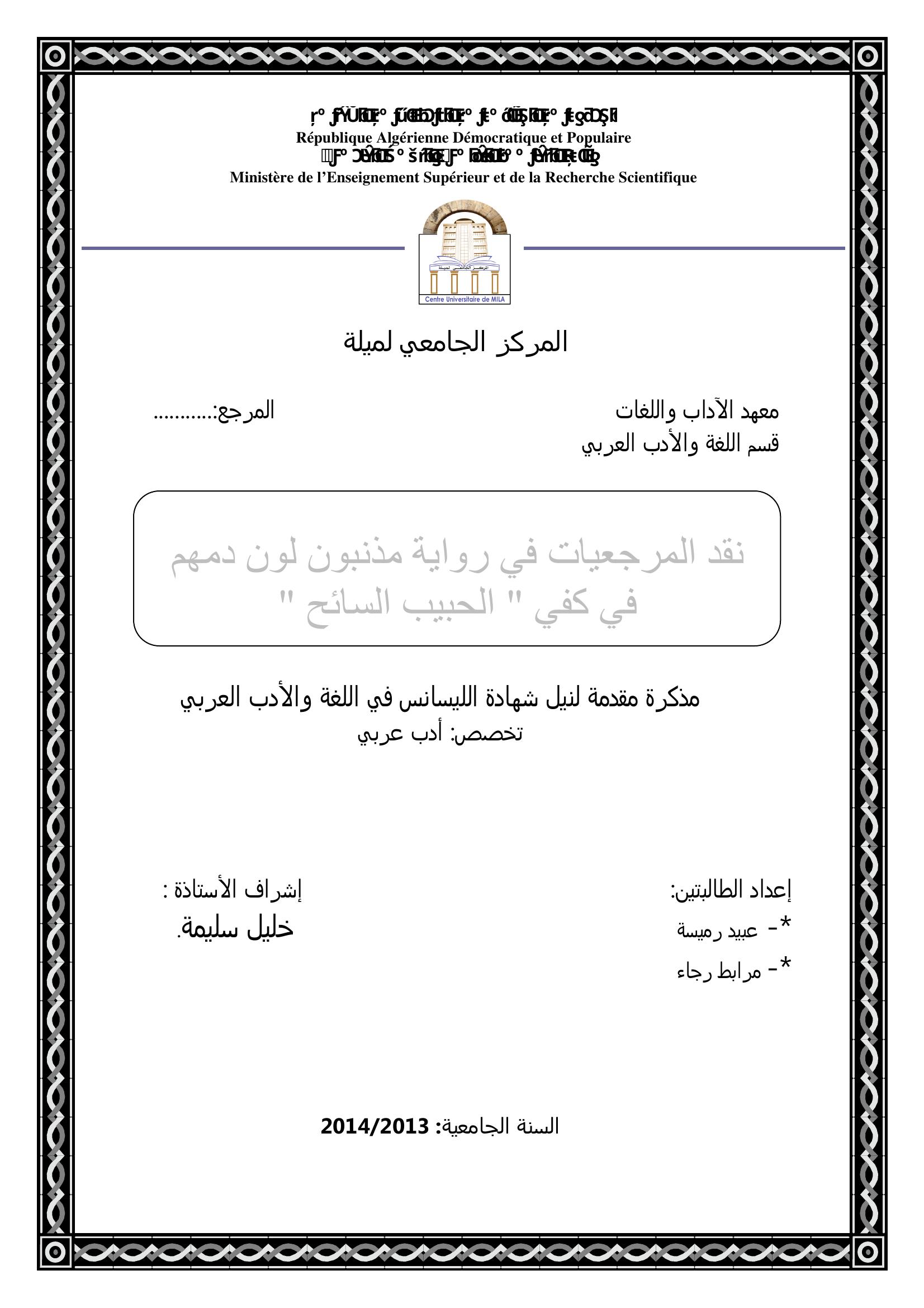 عبيد رميسة et al. (2014). نقد المرجعيات في رواية " مذنبون لون دمهم في كفي" للحبيب السايح.