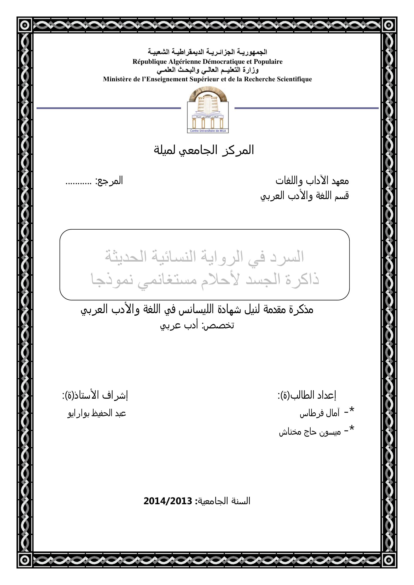 فرطاس أمال et al. (2014). السرد في الرواية النسائية الحديثة ذاكرة الجسد لأحلام مستغانمي أنموذجا.
