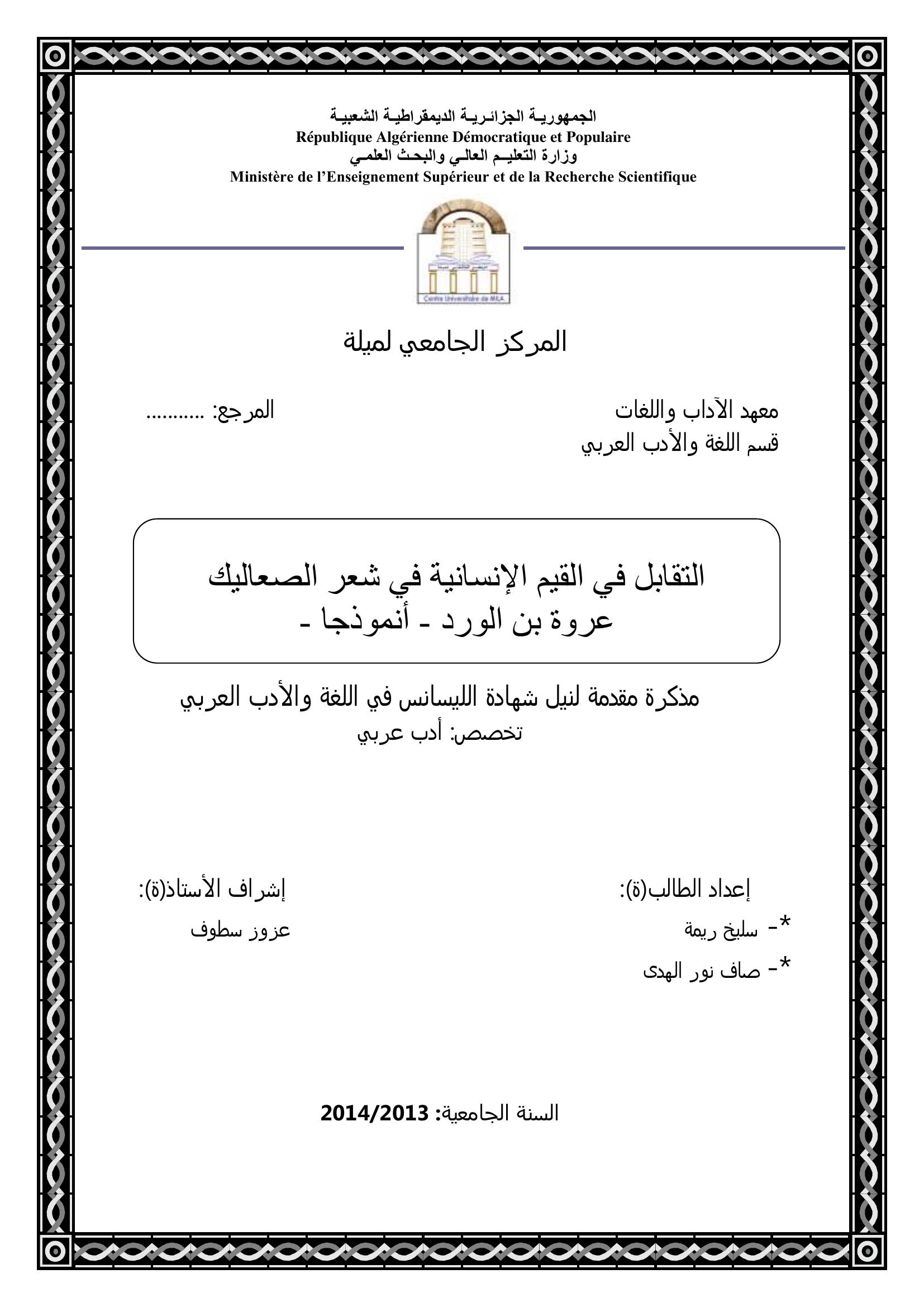 صاف نور الهدى et al. (2014). التقابل في القيم الإنسانية في شعر الصعاليك " عروة بن الورد " -أنموذجا -.