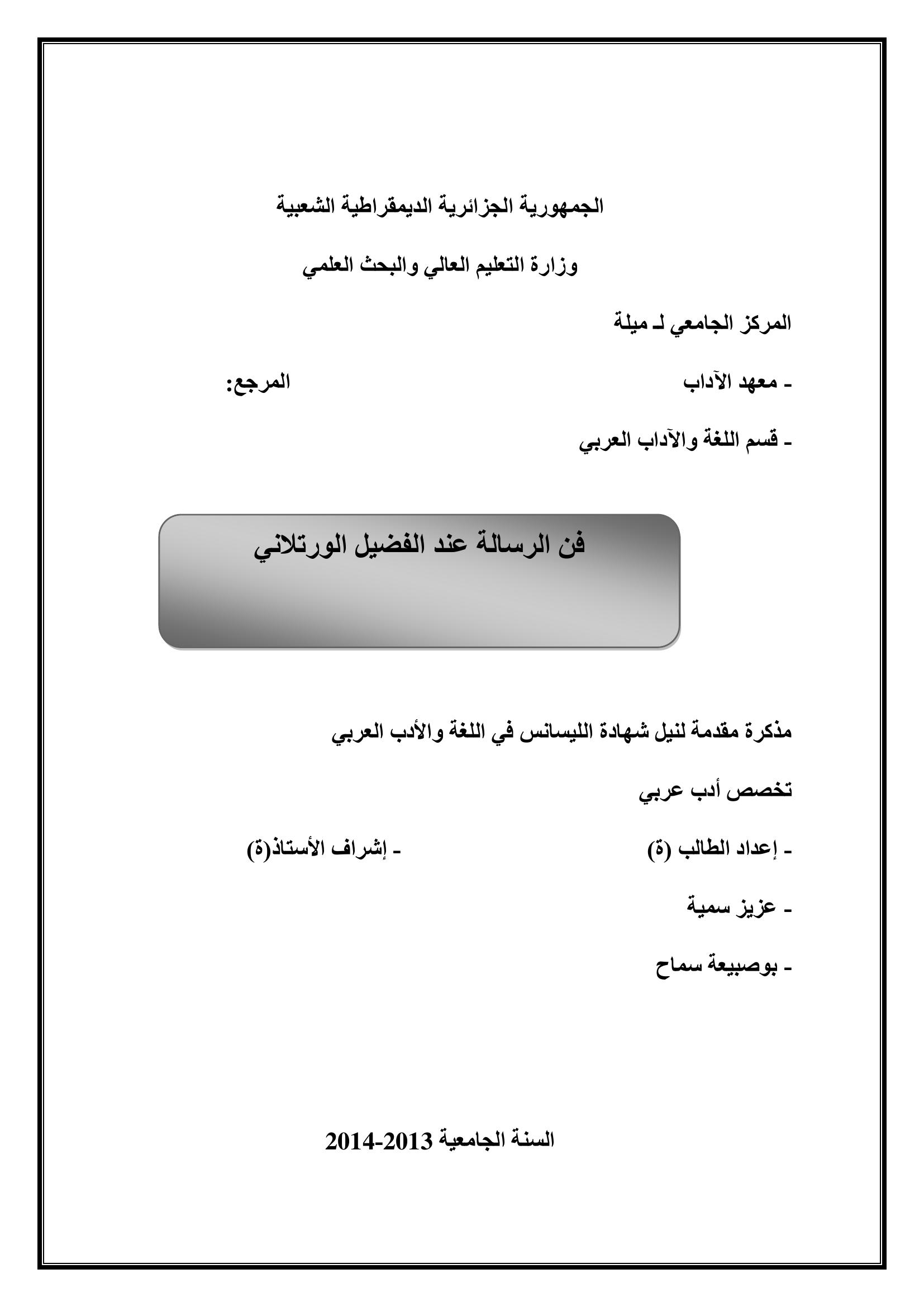 عزيز سمية et al. (2014). فن الرسالة عند الفضيل الورتلاني.