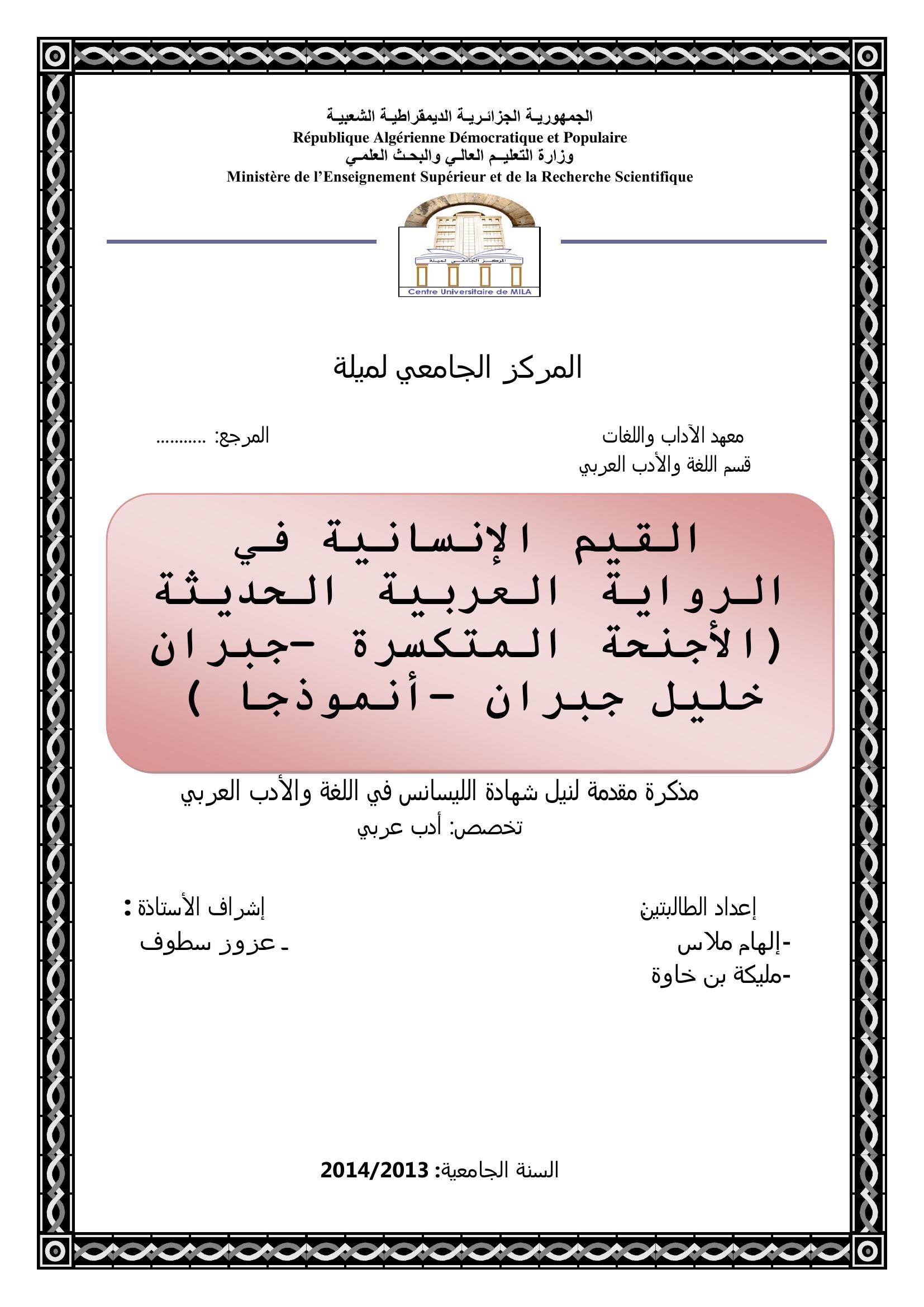 ملاس إلهام et al. (2014). القيم الإنسانية في الرواية العربية الحديثة " الأجنحة المتكسرة - جبران خليل جبران - أنموذجا".