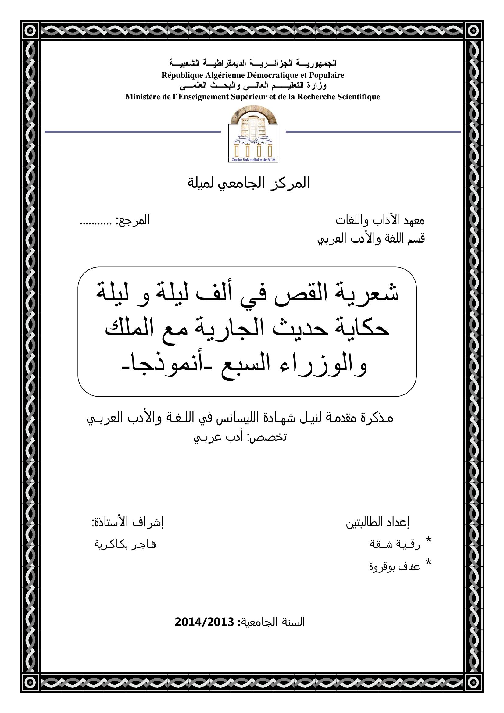 شقة رقية & بكاكرية هاجر (مشرفا) (2014). شعرية القص في ألف ليلة وليلة دراسة تطبيقية في حكاية حديث الجارية مع الملك ووزرائه السبعة.