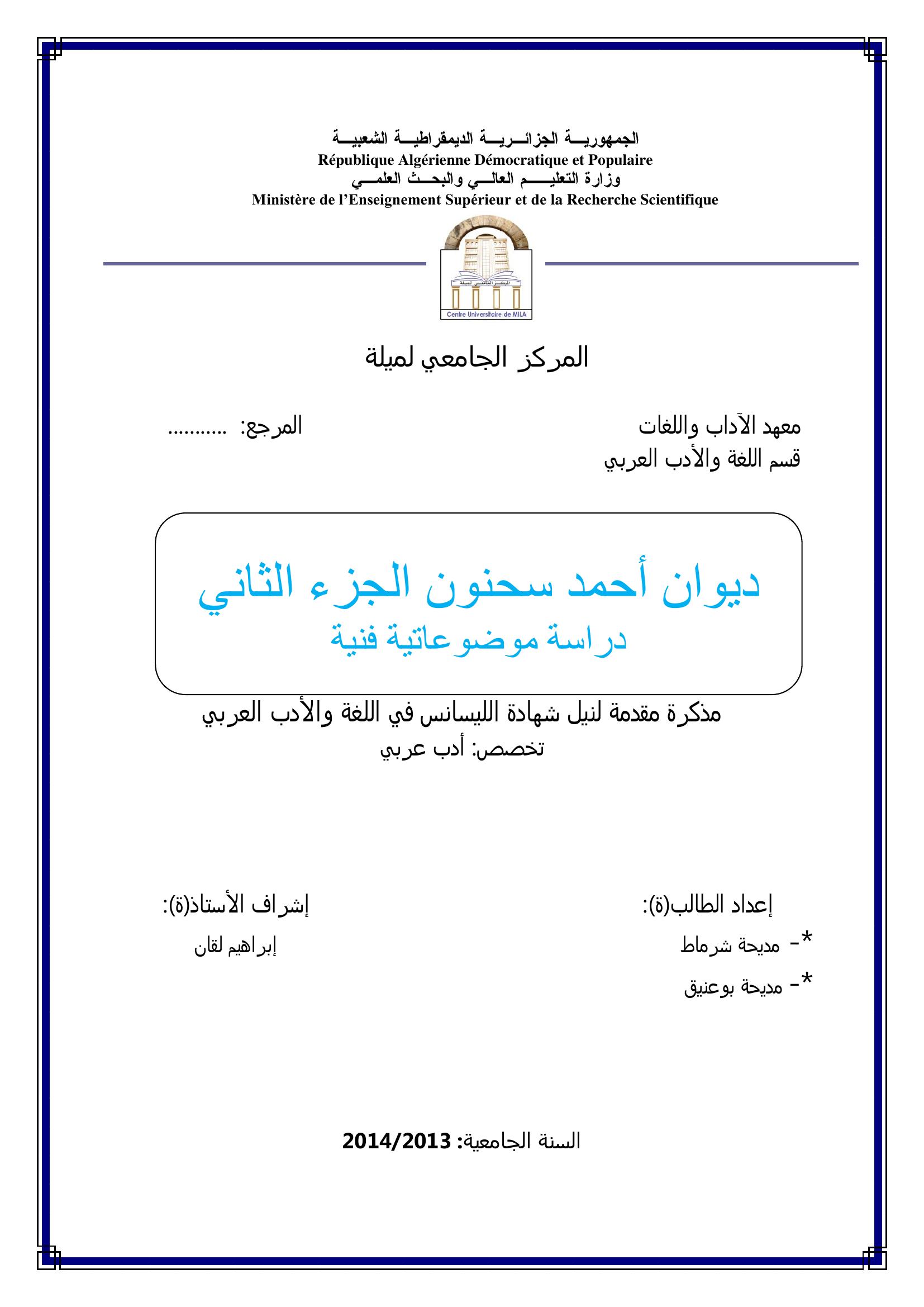 شرماط مديحة et al. (2014). ديوان أحمذ سحنون - الجزء الثاني - دراسة موضوعية.