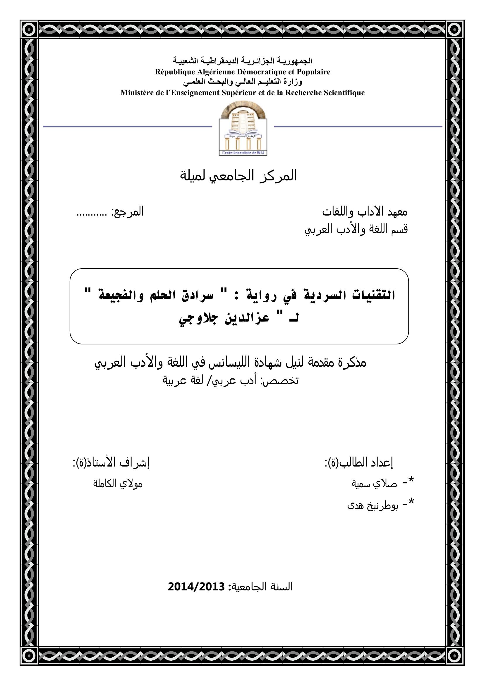 صلاي سمية et al. (2014). التقنيات السردية في رواية : "سرادق الحلم والفحيعة " لـ عز الدين جلاوي.
