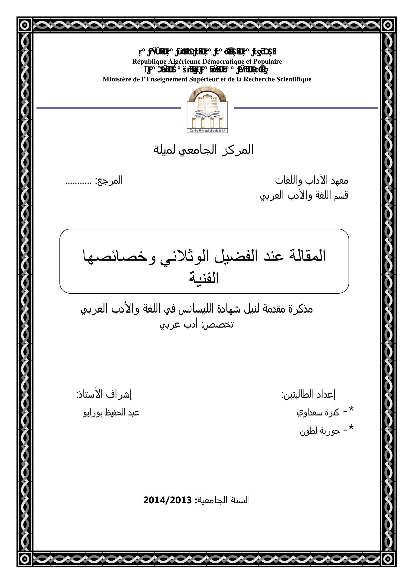 سعداوي كنزة et al. (2014). المقالة عند الفضيل الورثلاني وخصائصها الفنية.