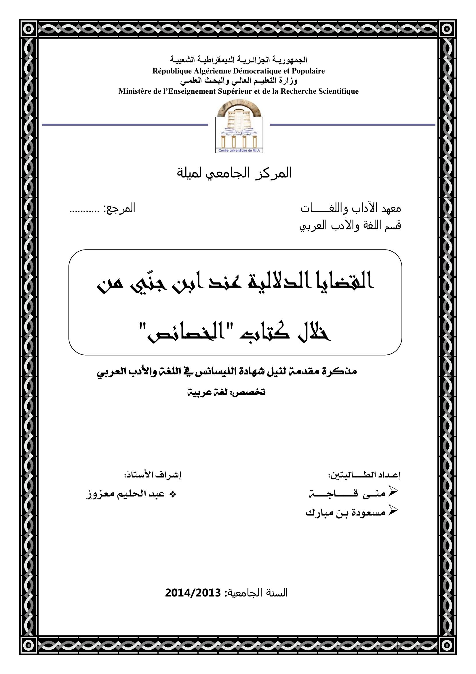 قاجة منى et al. (2014). القضايا الدلالية عند ابن جني من خلال كتاب "الخصائص".