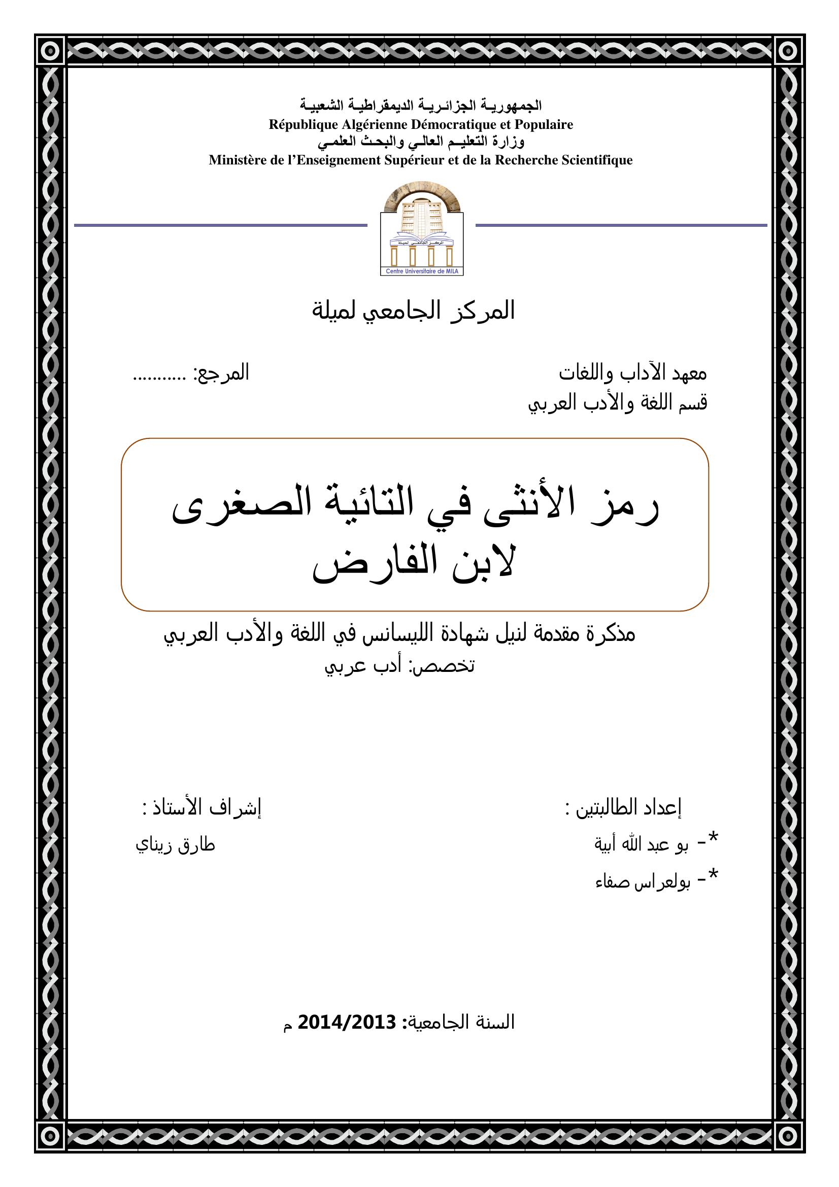 بو عبد الله أبية et al. (2014). رمز الأنثى في التائية الصغرى لإبن الفارض.