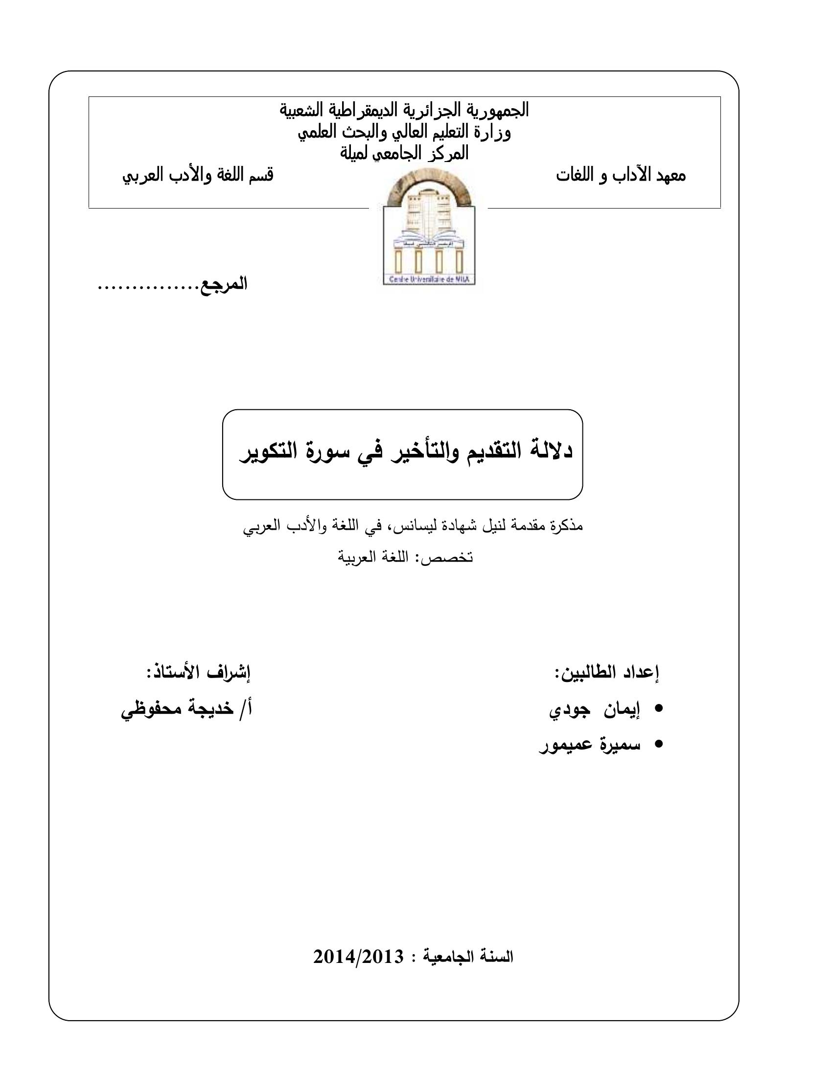 جودي إيمان et al. (2014). دلالة التقديم والتأخير في سورة التكوير.