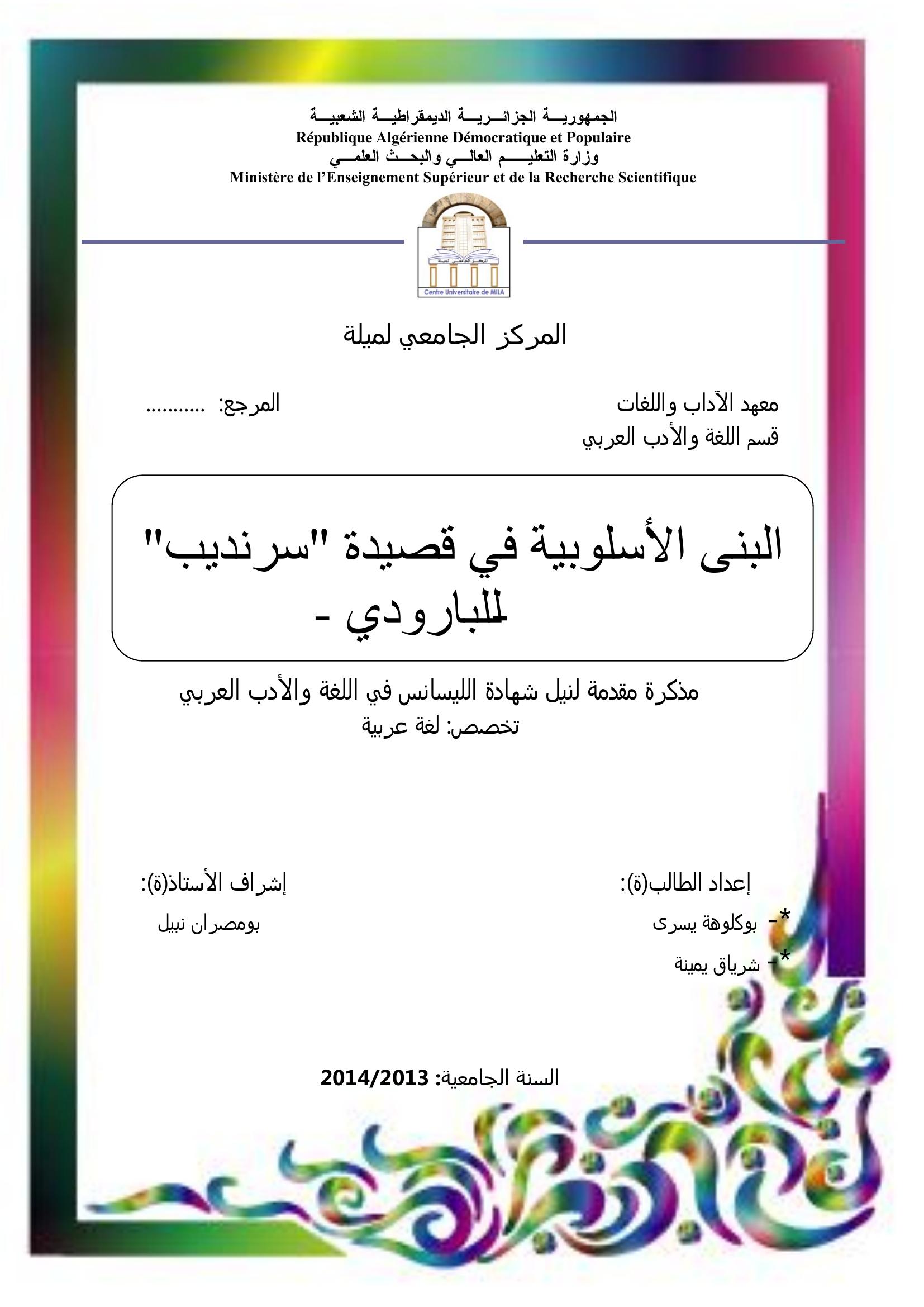 بوكلوهة يسرى et al. (2014). البنى الأسلوبية في قصيدة "سرنديب" - للبارودي -.