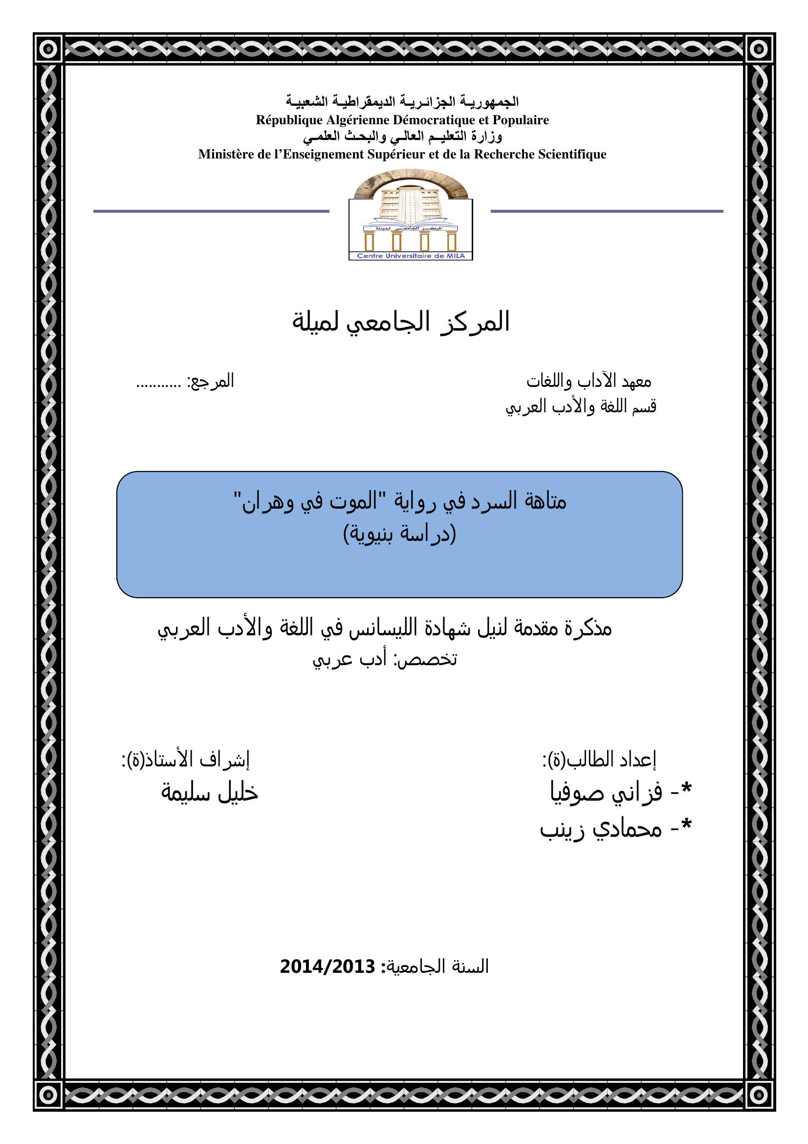 فزاني صوفيا et al. (2014). متاهة السرد في رواية " الموت في وهران " للحبيب السائح (دراسة بنيوية).