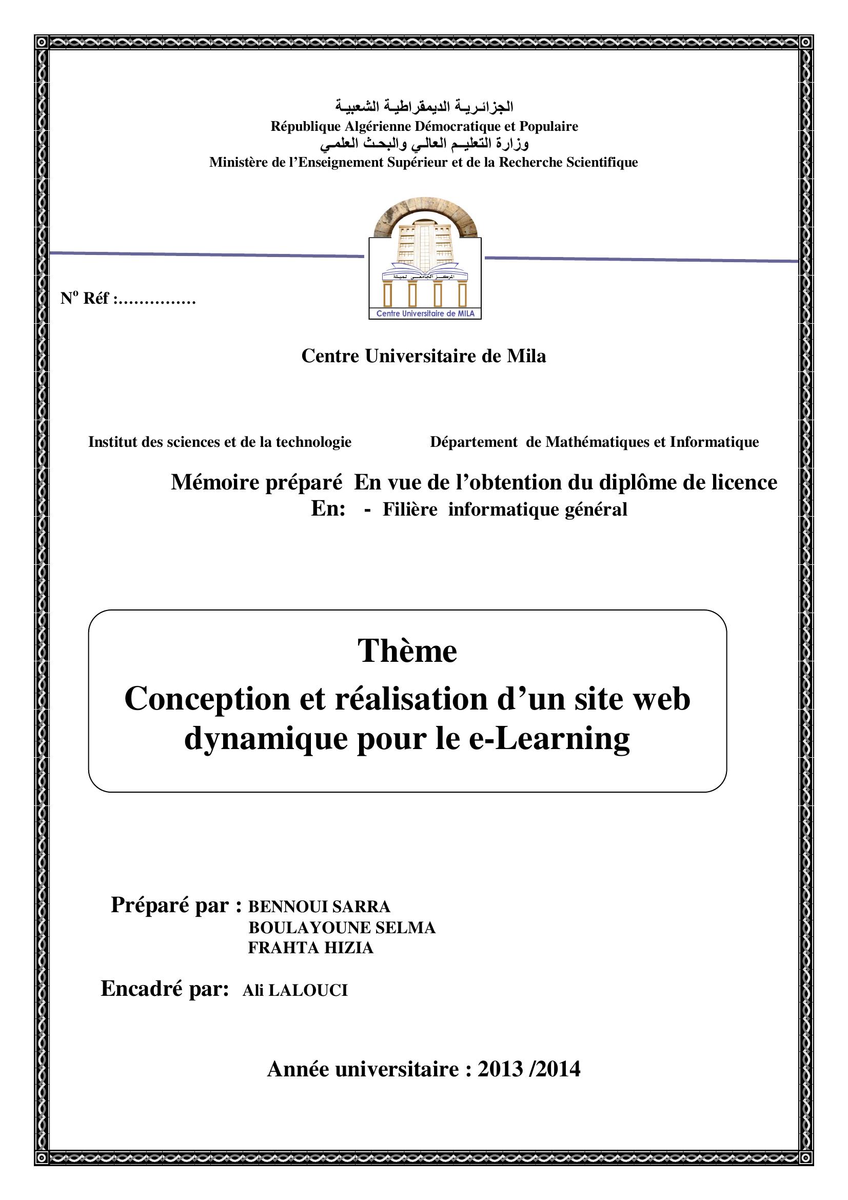 BENNOUI Sarra & Ali LALOUCI encadreur (2014). Conception et réalisation d'un sit web dynalique pour le e-learning.