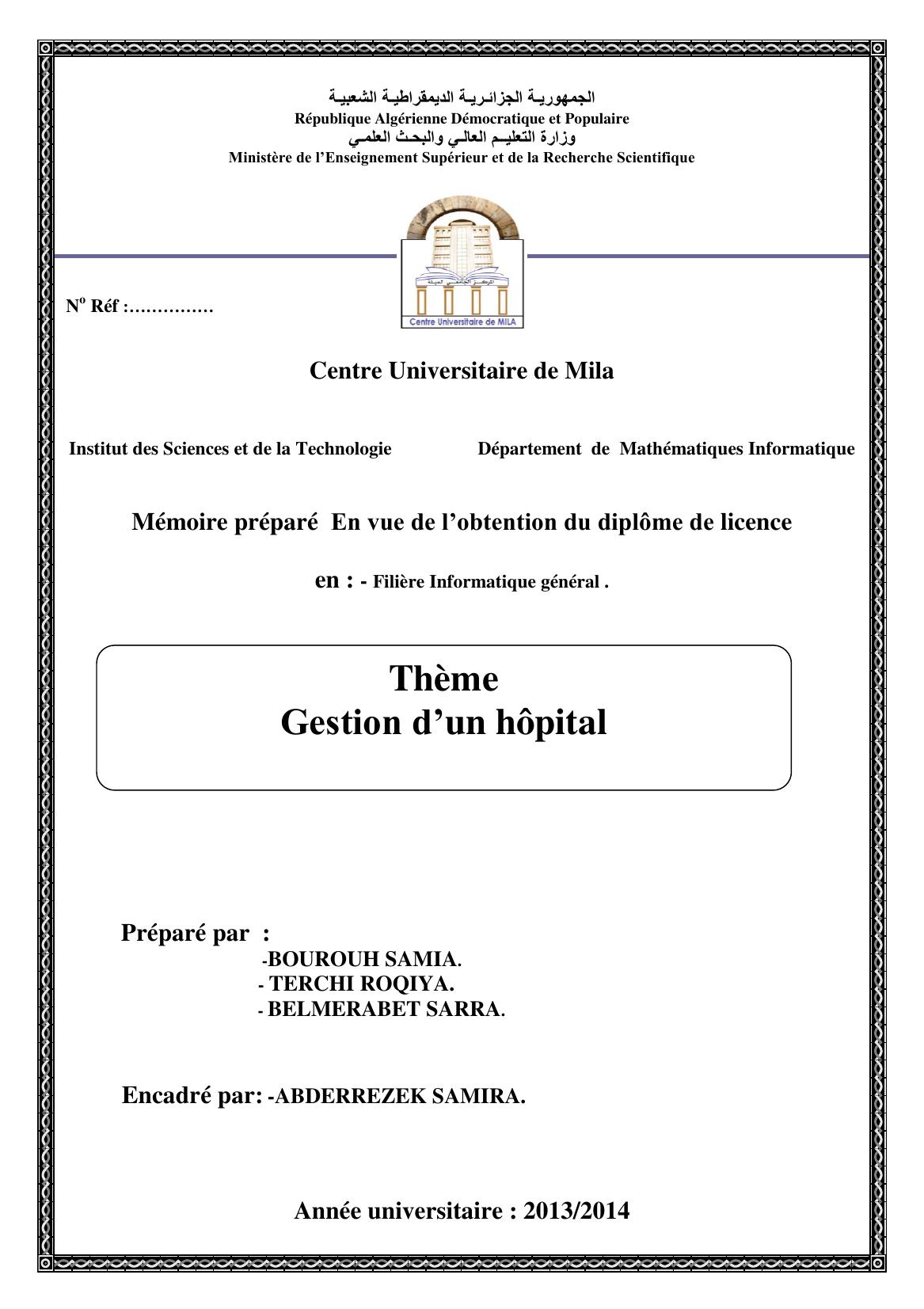Bourouh Samia & Abderrezek Samira (encadreur) (2014). Gestion d'un hôpital.