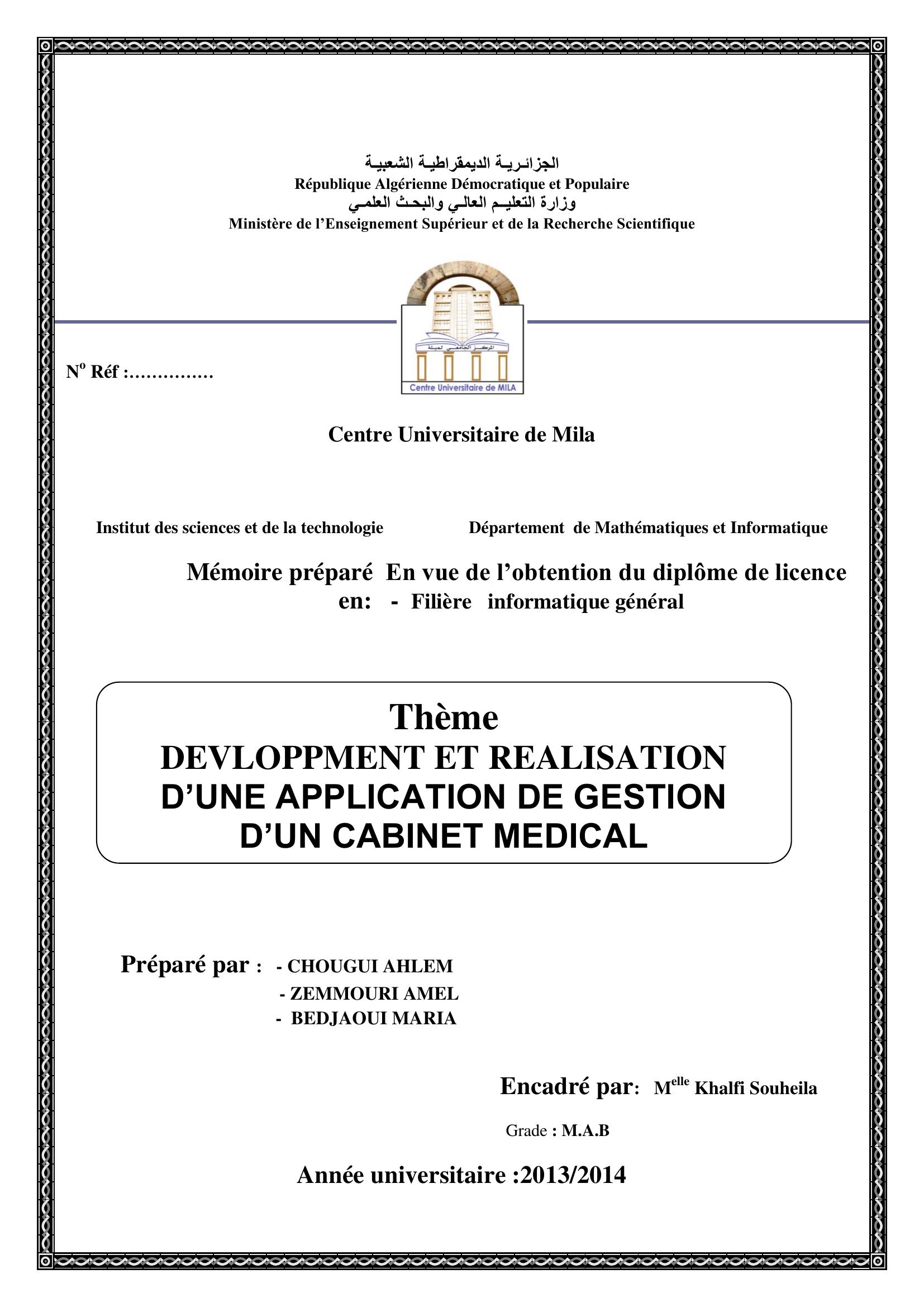 Chouggui Ahlem & Khalfi Souheila( encadreur) (2014). Dévloppment et réalisation d'une application de gestion d' un cabinet medical.