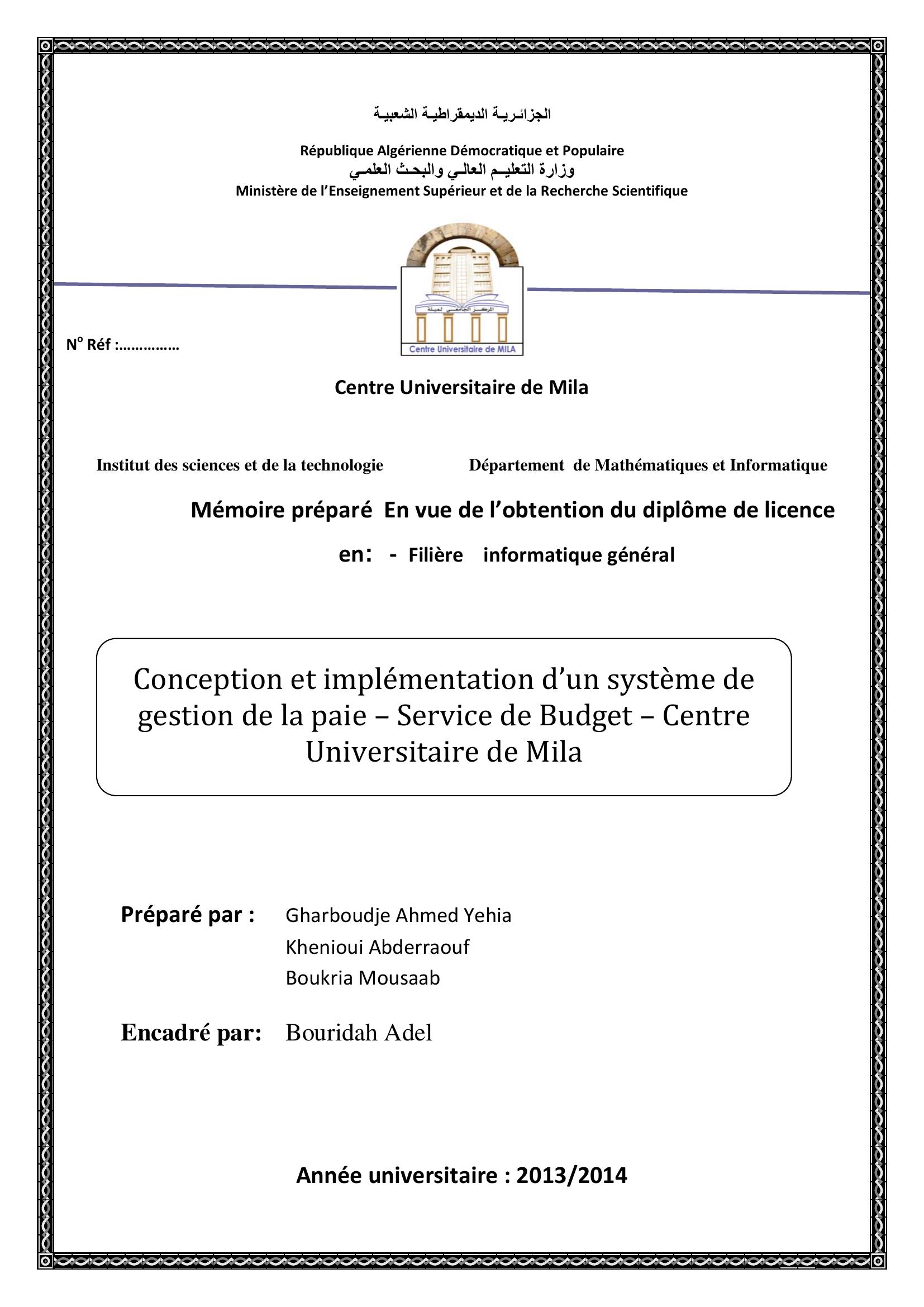 Gharbouje Ahmed Yehia & Bouridah Adel (encadreur) (2014). Conception et implémentation d'un système de gestion de la paie-service de budget - Centre Universitaire de mila.