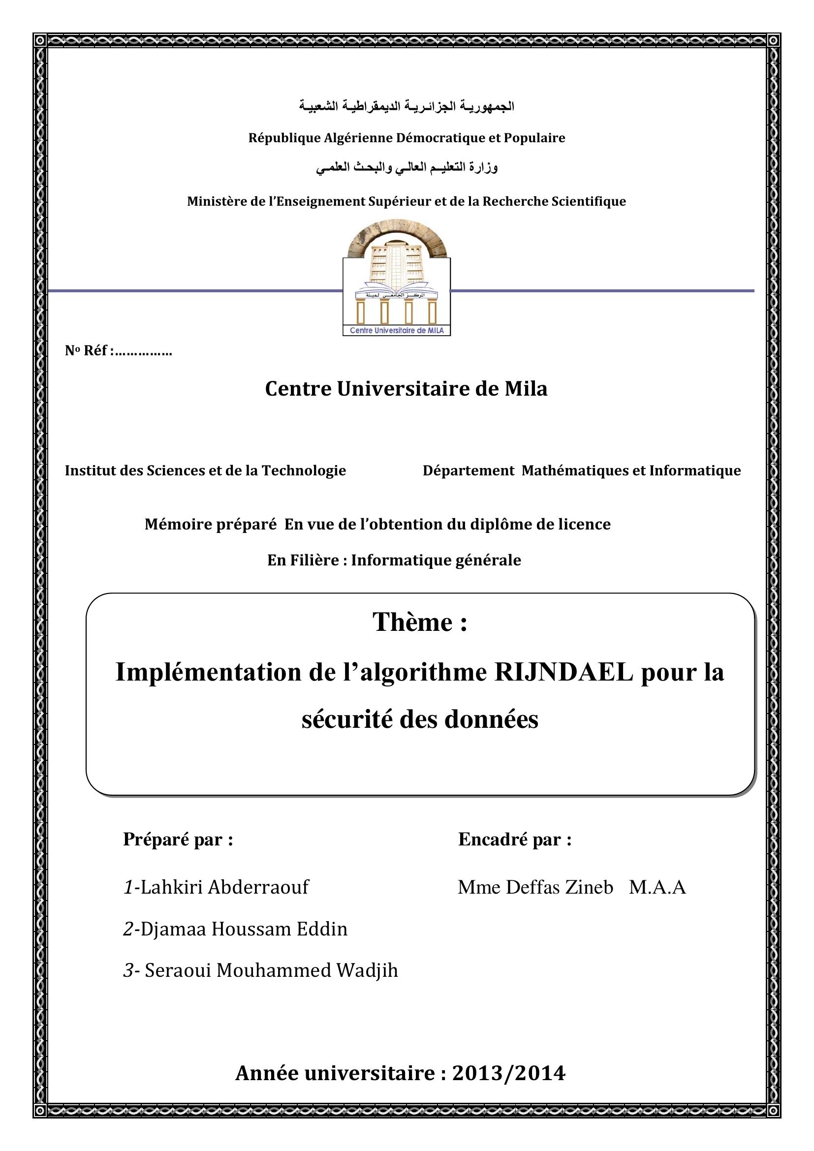 Lahkiri Abderraouf & Deffas Zineb (encadreur) (2014). Implémentation de l'algorithme RIJNDAELpour la sécurité des données.