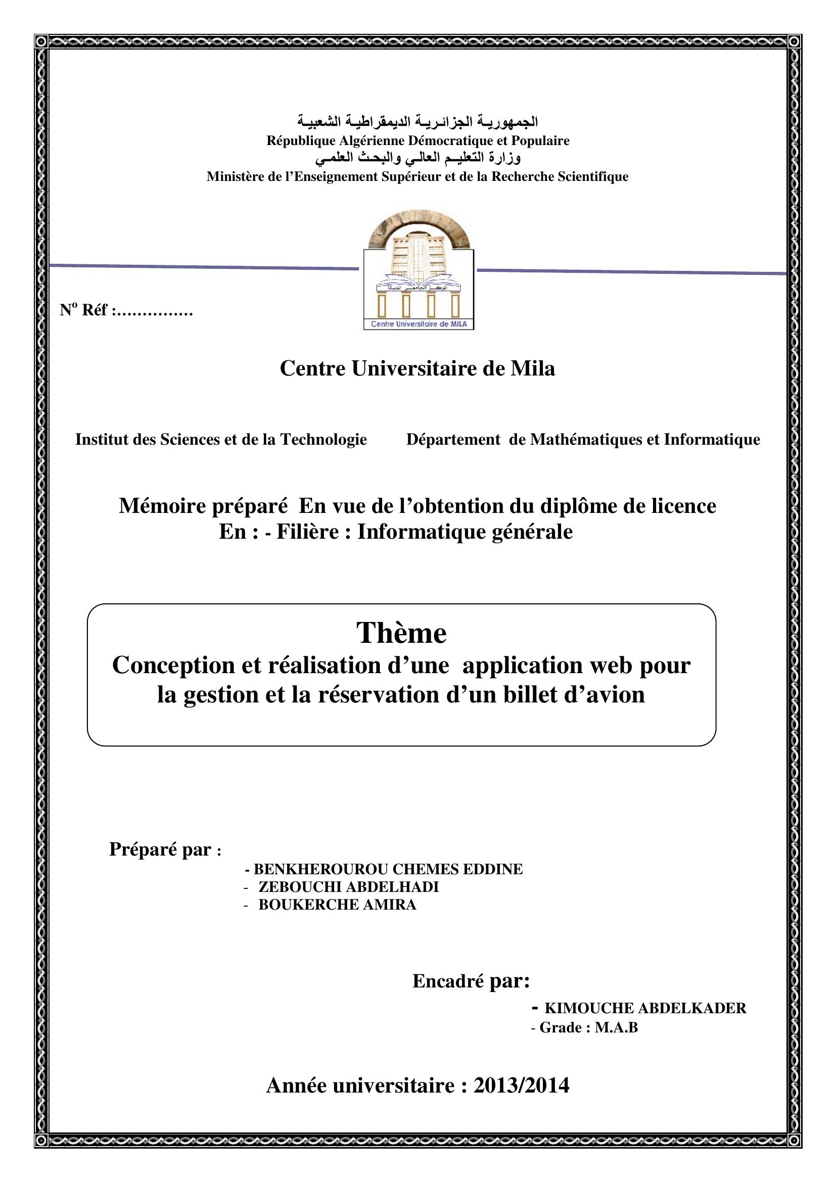 BOUKERCHE amira & Kimouche Abdelkader encadreur (2014). Conception et réalisation d'une application web pour la gestion et la réservation d'un billet d'avion.
