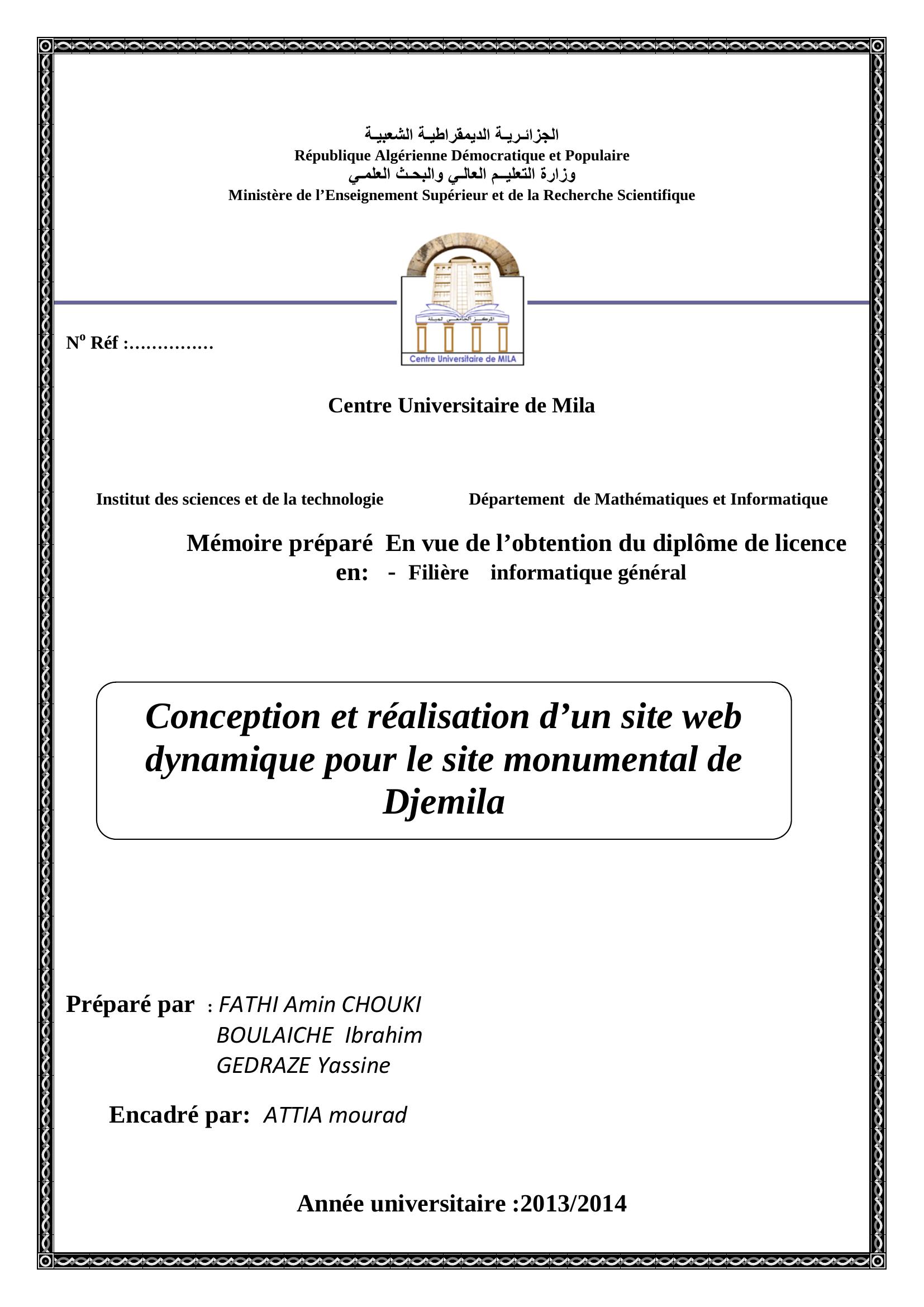 Fathi Amin chouki & ATTIA mourad encadreur (2014). Conception et réalisation d'un site web dynamique pour le site monumental de Djemila-.