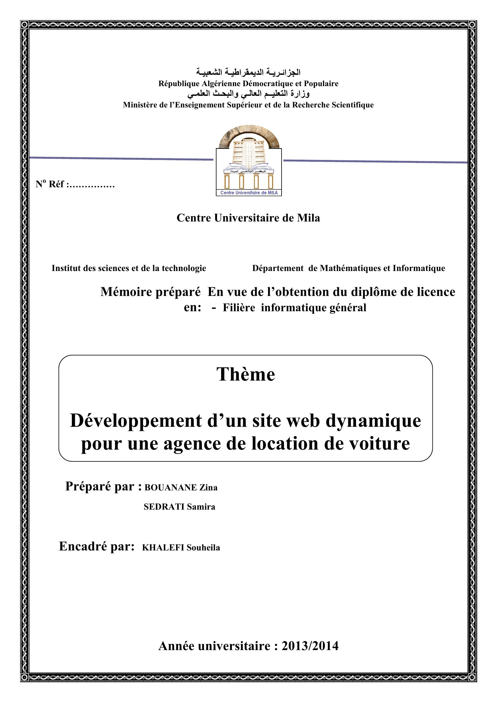 Bouanane Zina & KHALEFI Souheila encadreur (2014). Développement d'un site web dynamique pour une agence de location de voiture.