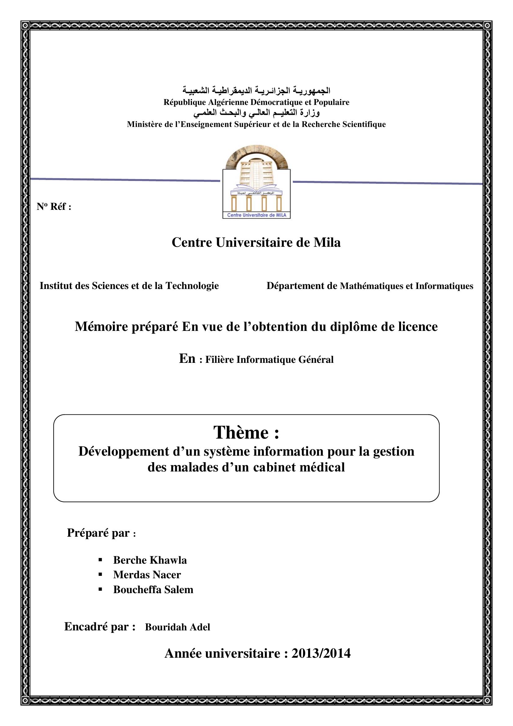 Berche Khawla & Bouridah Adel (encadreur) (2014). Développement d'un système information pour la gestion des malades d'un cabinet médical.