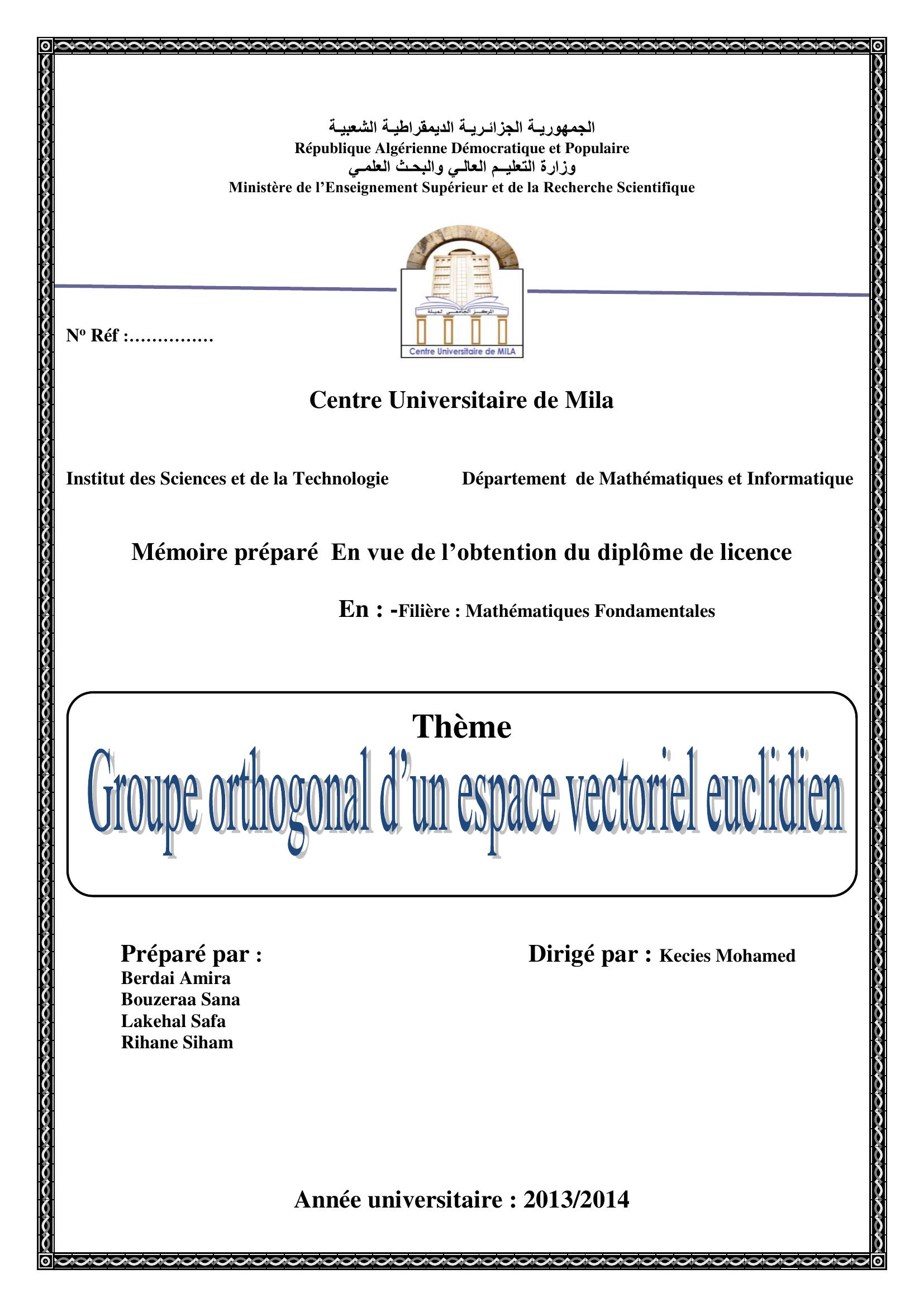 Berdai Amira & Kecies Mohamed encadreur (2014). Groupe orthogonal d'un espace vectoriel euclidien.