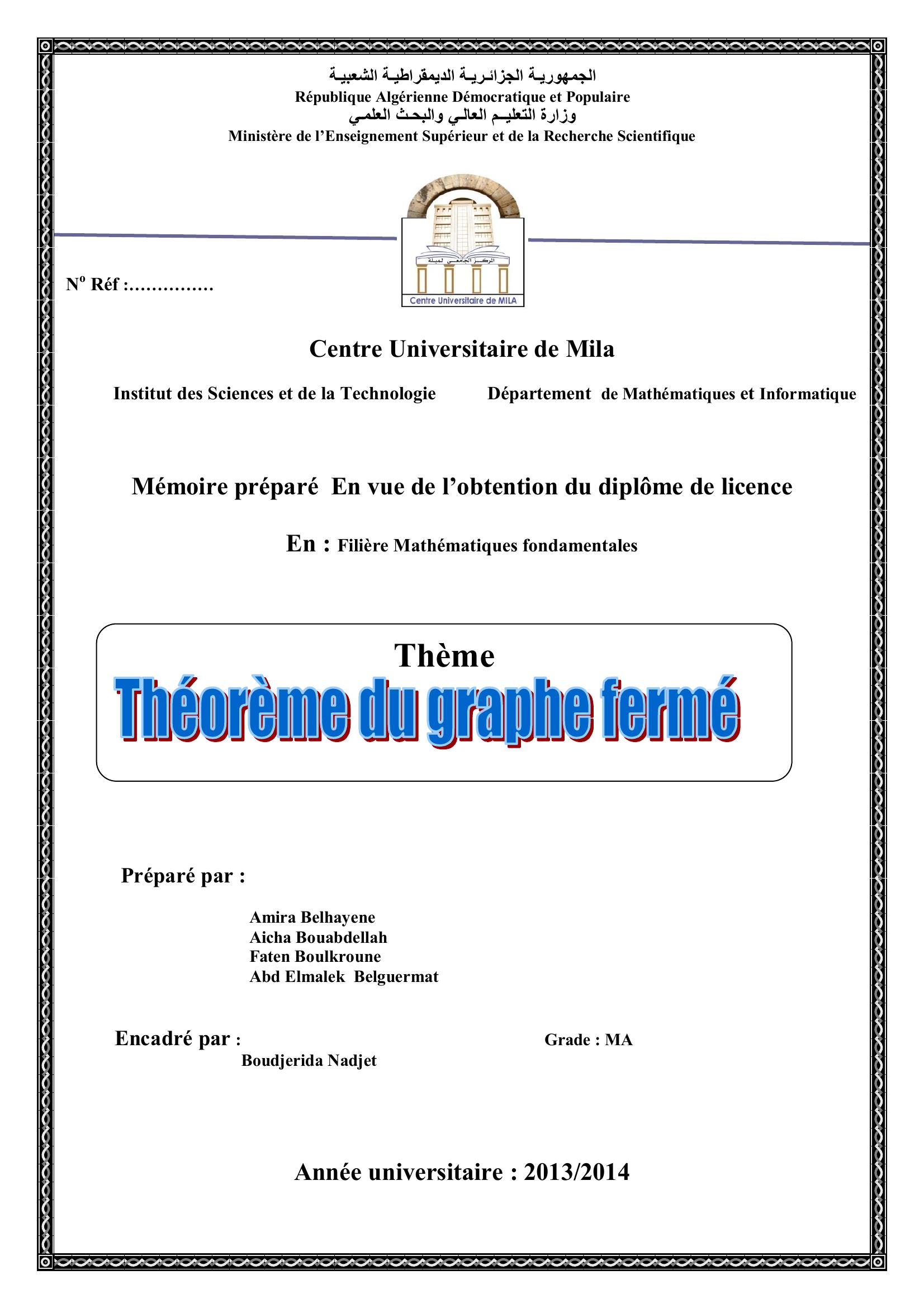 Belhayene Amira & Boudjerida Nadjet encadreur (2014). Théorème du graphe fermé.